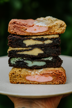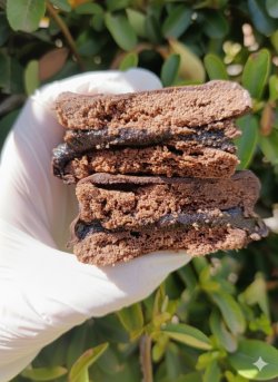 Alfajor Vegano 1- ALIMENTOS & BEBIDAS Masa de cacao, oliva y naranjas, relleno de dulce de leche de coco o dátiles, cubierto con chocolate…
