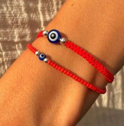 Las pulseras las realizo utilizando hilo chino, mostacillas y en algunos diseños, ojos turcos. Comienzo formando el tejido…