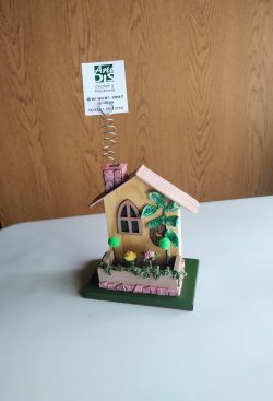 Casitas de Papel 3- DECORACIÓN, HOGAR y JARDÍN Realizada en madera, muestra un pequeño jardín con plantas tejidas. Cuenta con accesorio para sujetar tarjeta, anotación, etc.…