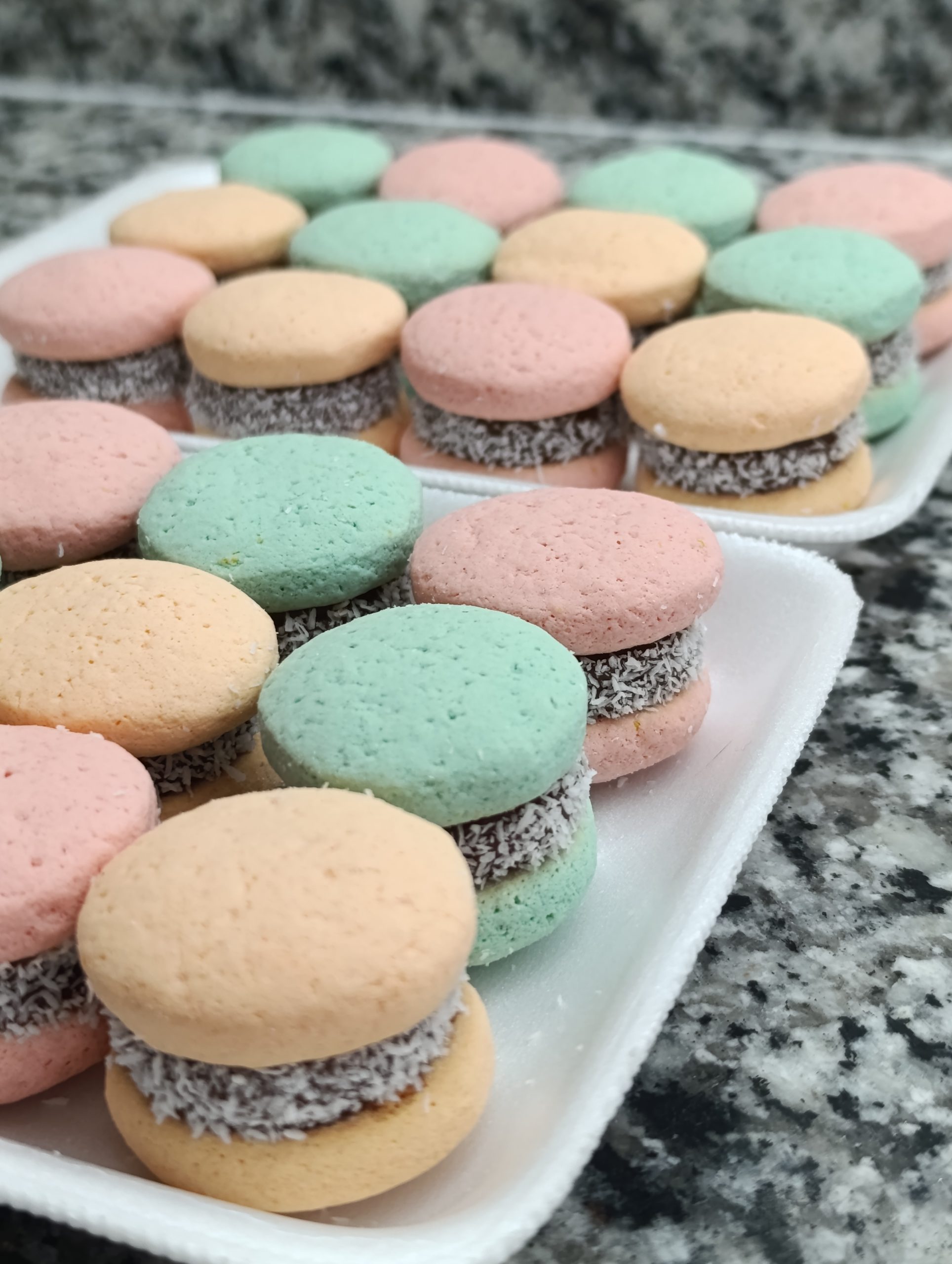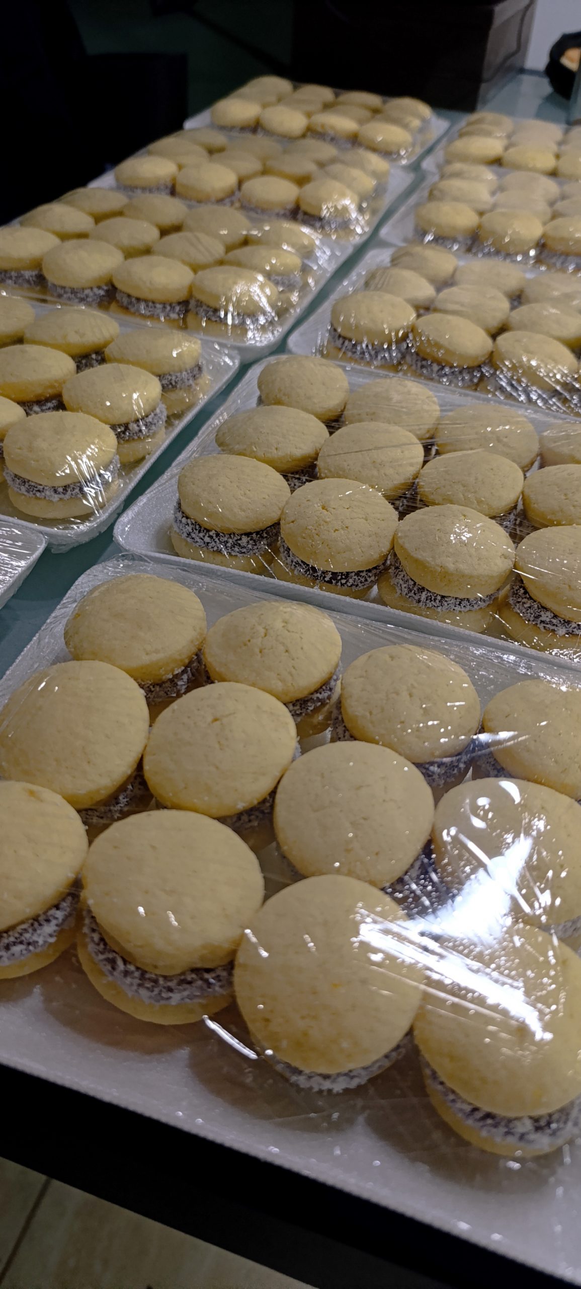 Nuestros alfajores de maicena se elaboran de manera artesanal, cuidando cada detalle del proceso. Están hechos con una selección de ingredientes simples y de calidad: harina, fécula de maíz, azúcar, margarina y huevo, combinados con bicarbonato de sodio y polvo de hornear para lograr una textura suave y delicada. La ralladura de limón, la esencia de vainilla y un sutil toque de cognac aportan ese aroma especial que recuerda a las recetas caseras de antaño. Se rellenan con abundante dulce de leche y se terminan con coco rallado, logrando un alfajor tierno, equilibrado y lleno de sabor, que se deshace en la boca.