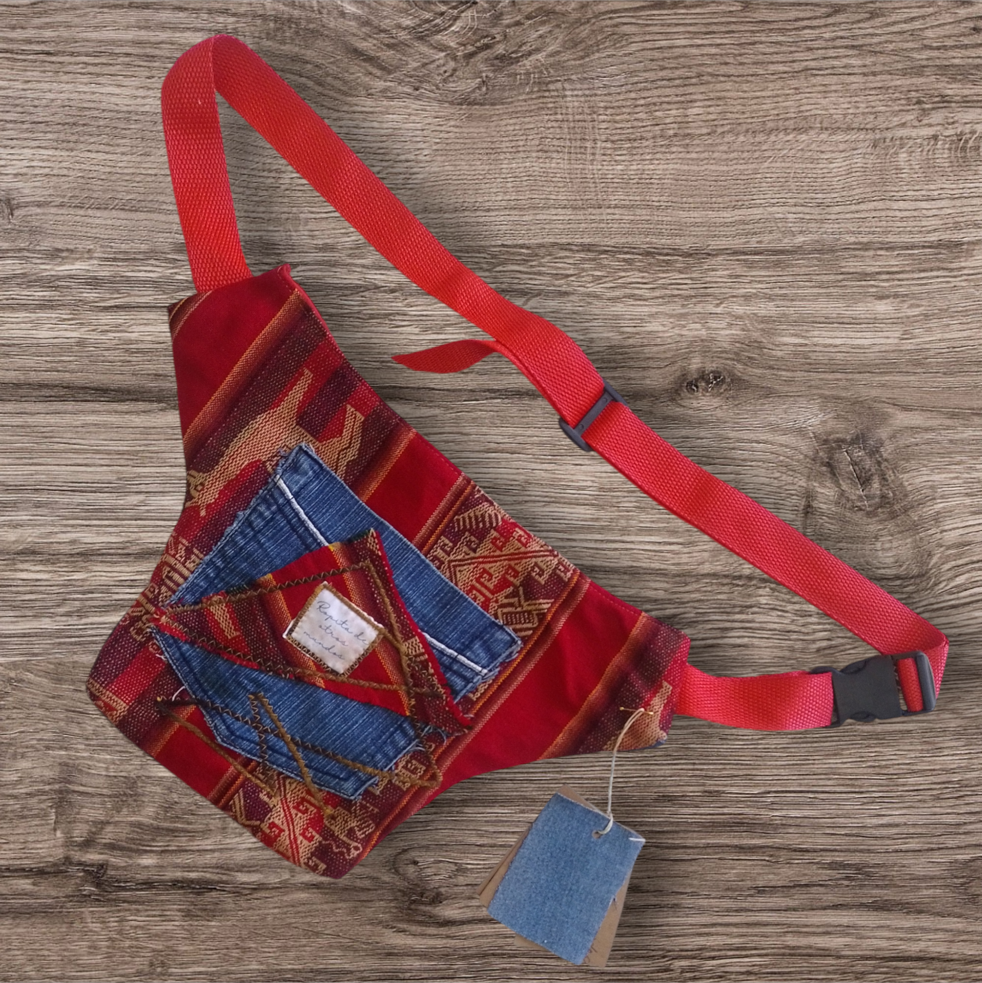 Alforja de jean y Aguayo con bolsillo de jean,se ajusta a la cintura.