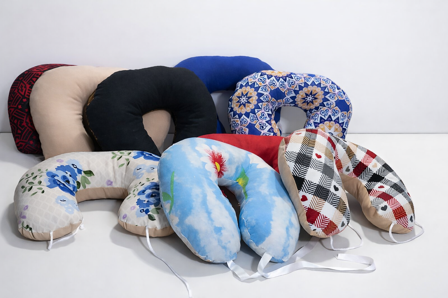 Almohadas confeccionadas en friselina blanca de 80 g, rellenas con vellón premium blanco. Disponibles en medidas de 70 x 45 cm y 60 x 40 cm. Formato clásico. Almohada cervical de viaje confeccionada en tela tropical, disponible en versiones estampadas y lisas, rellena con vellón.