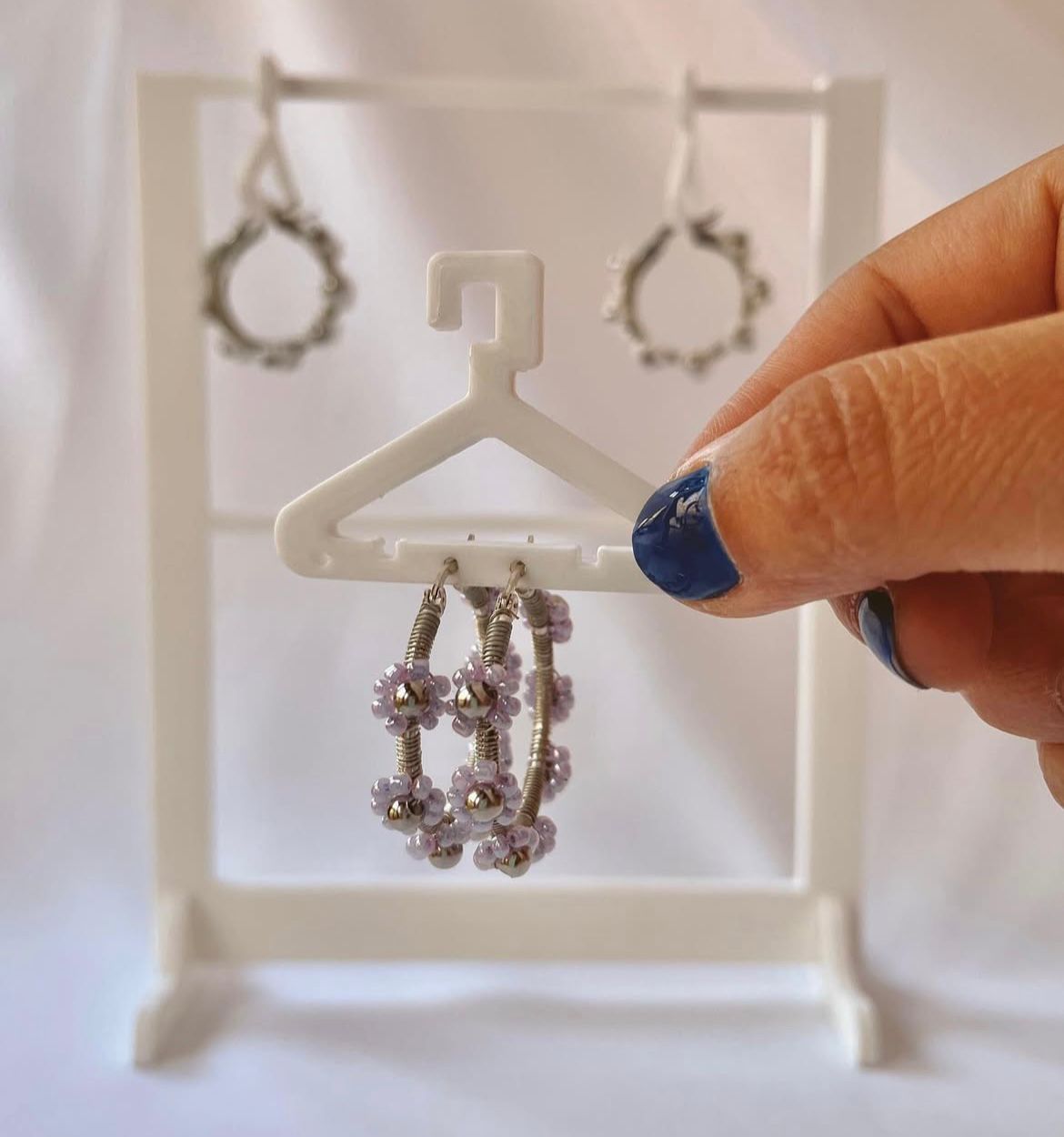 Realizo los aros utilizando alambre de acero quirúrgico, cristales y mostacillas de acero. Primero selecciono el tamaño de la argolla y luego defino la combinación de colores que voy a emplear. A continuación, ensarto los cristales y las mostacillas en el alambre, y comienzo a enrollarlo alrededor del aro para darle rigidez y firmeza. Después, utilizo ese mismo alambre para enrollar y dar forma a las flores con las mostacillas y cristales. La cantidad de flores varía según el diámetro de la argolla. Finalmente, realizo un último enrollado de alambre limpio (solo el alambre) para reforzar y asegurar una terminación firme y prolija.