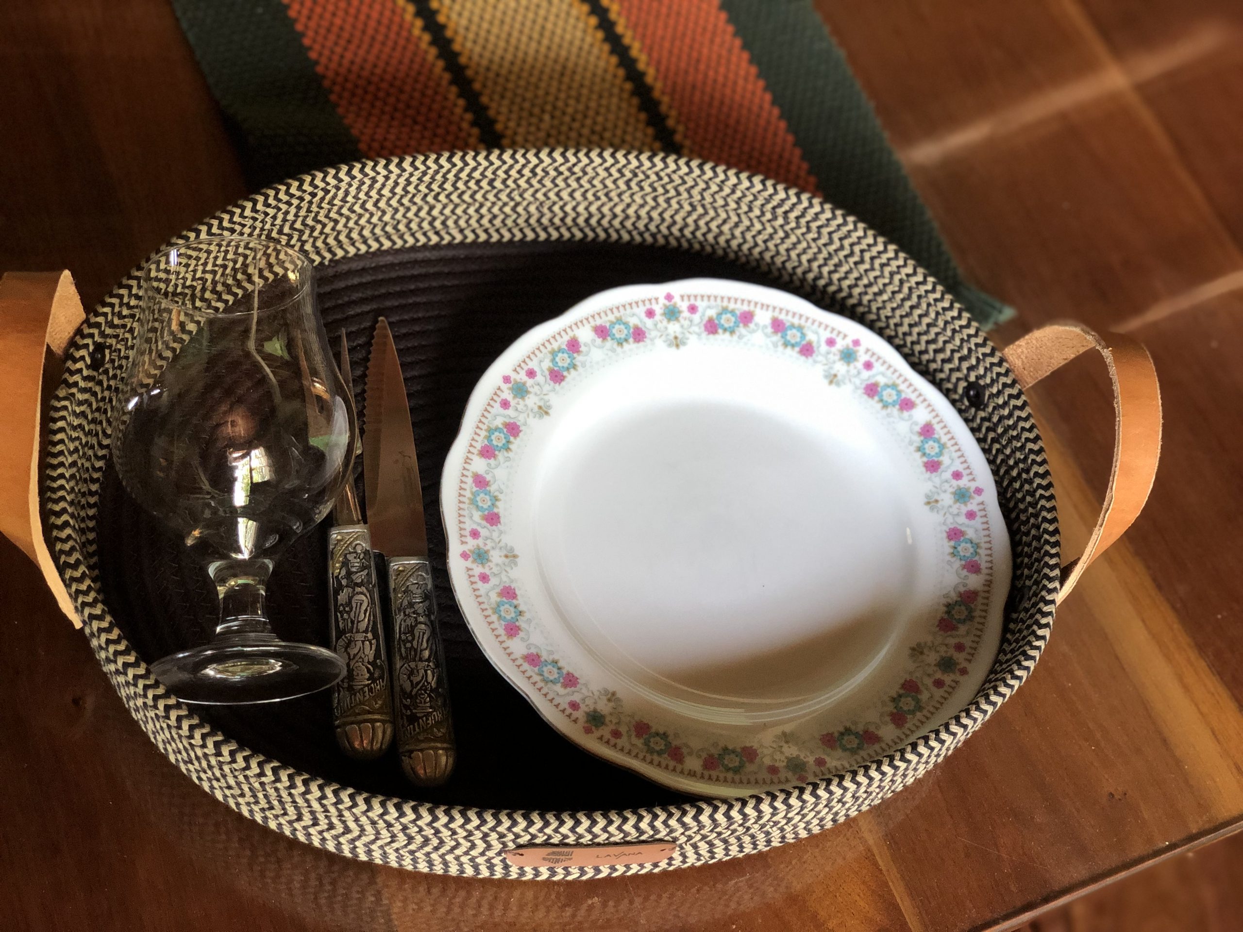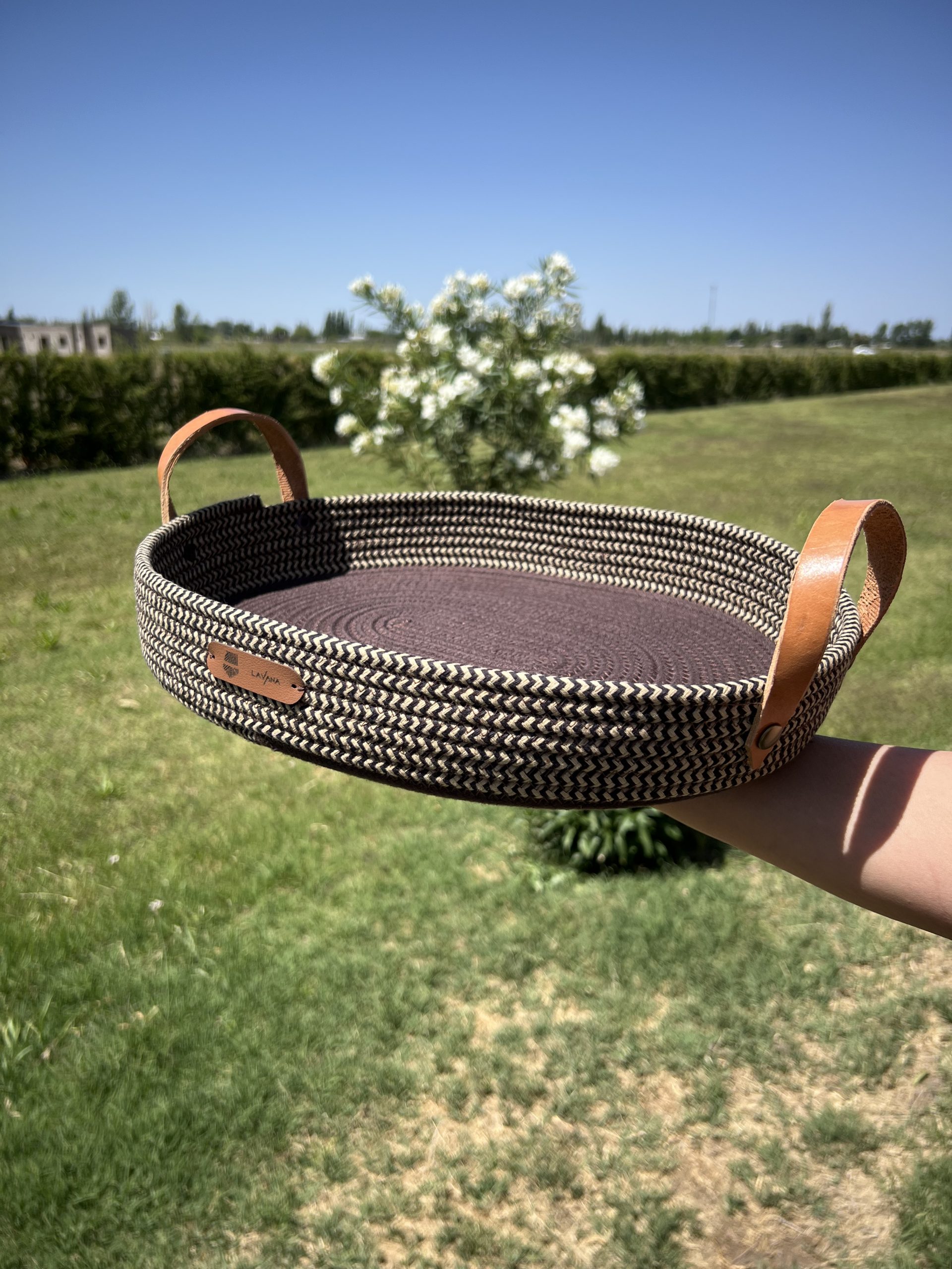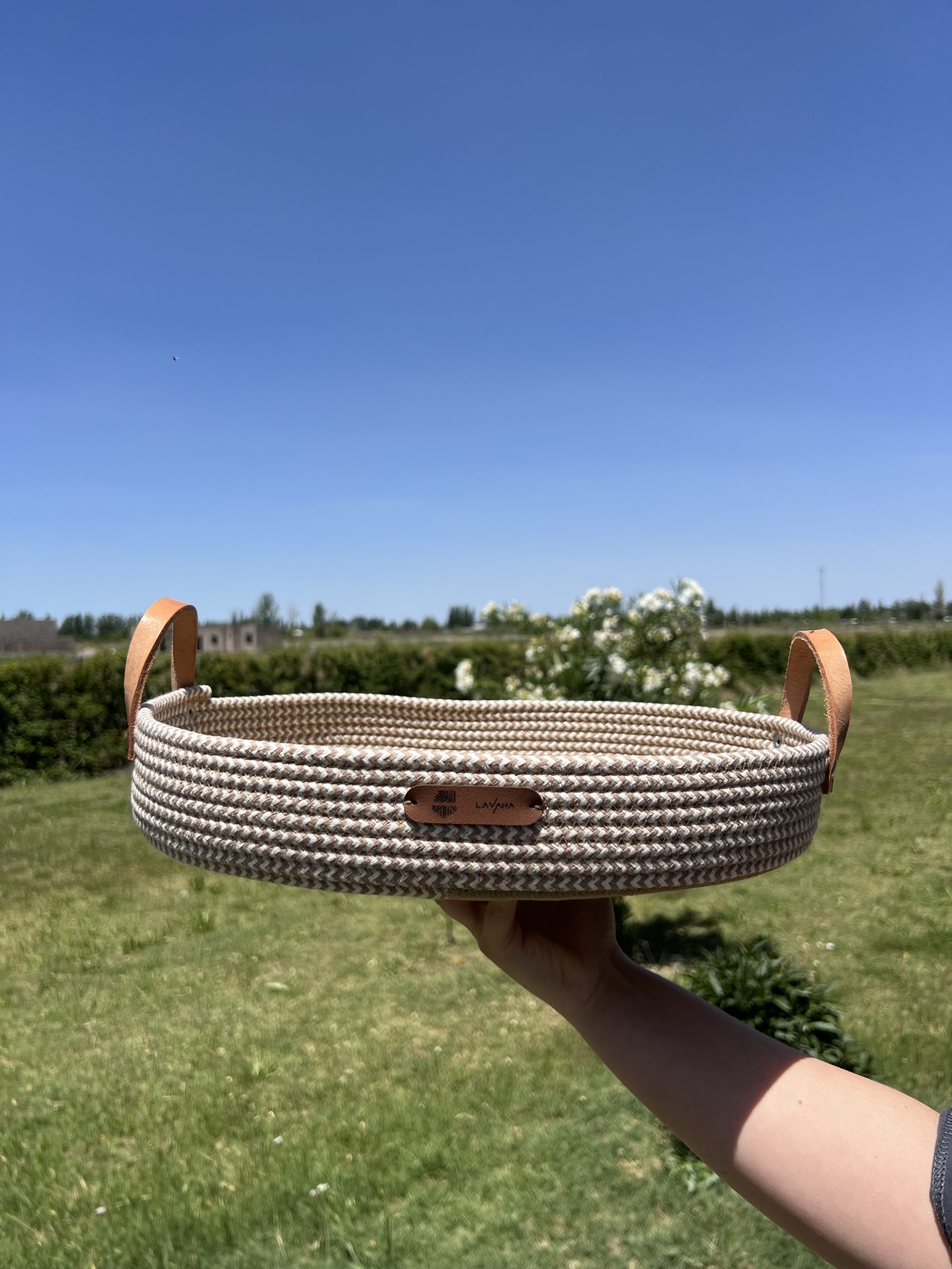 Material: cordón de algodón con alma( relleno de pabilos de algodón) cosido a máquina con hilo resistente n• 50, con asas de cuero reforzadas con remaches. En forma ovalada, mide en su base 36cm x 28cm y 6 cm de alto. Combinadas colores cálido, nude.