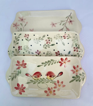 Bandeja de cerámica artesanal, realizada en barbotina líquida y pintada a mano, con esmaltado de alta calidad. Medidas: 27 cm de largo x 13,5 cm de ancho. Ideal para servir desayunos, picadas, postres o usar como base decorativa en cualquier espacio.