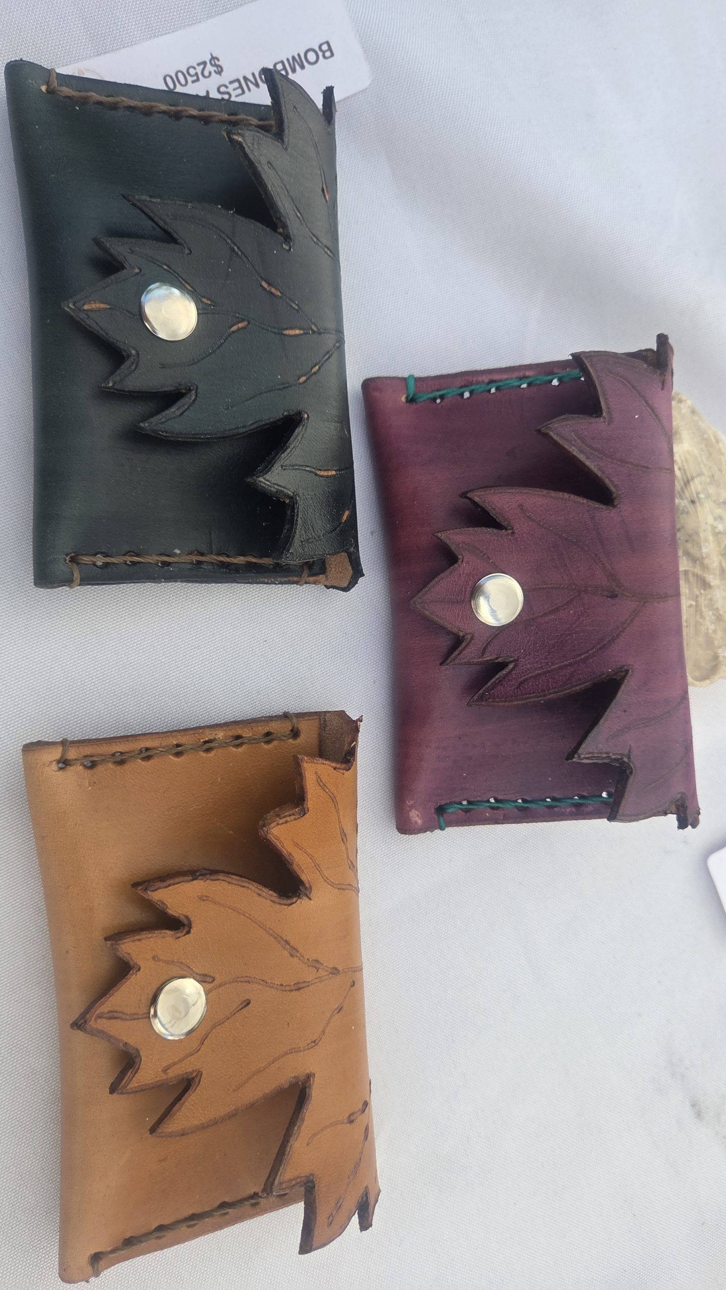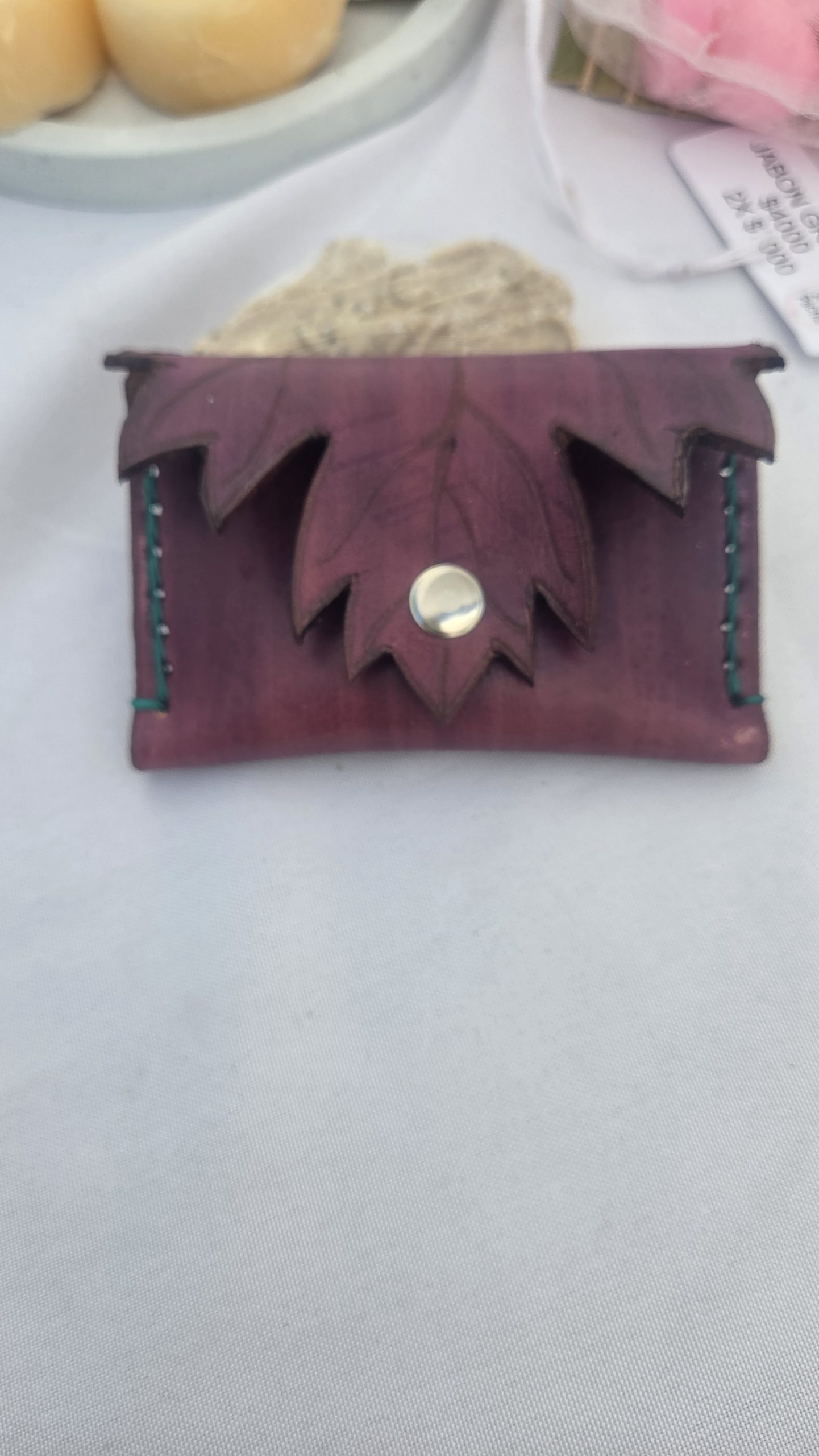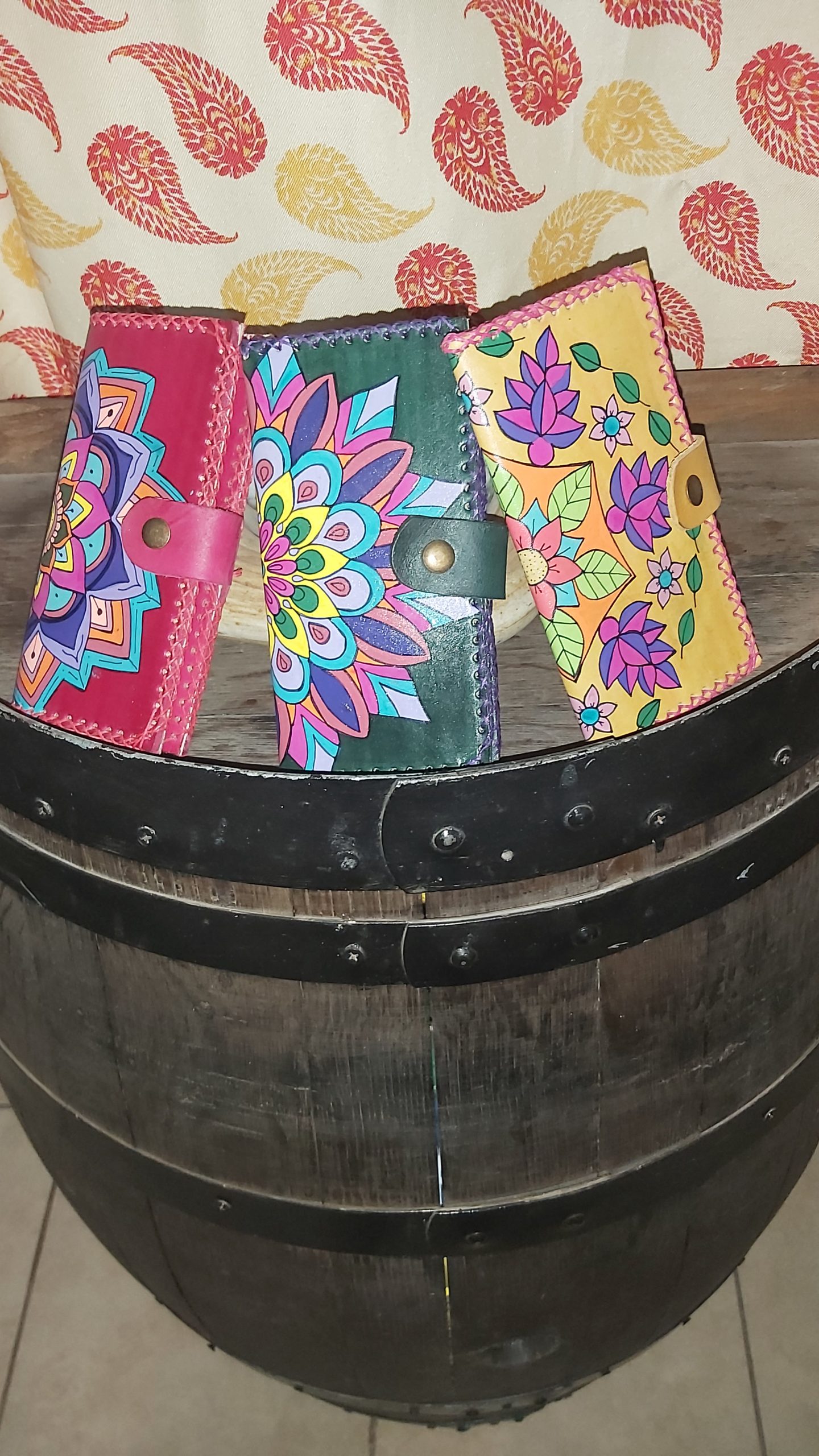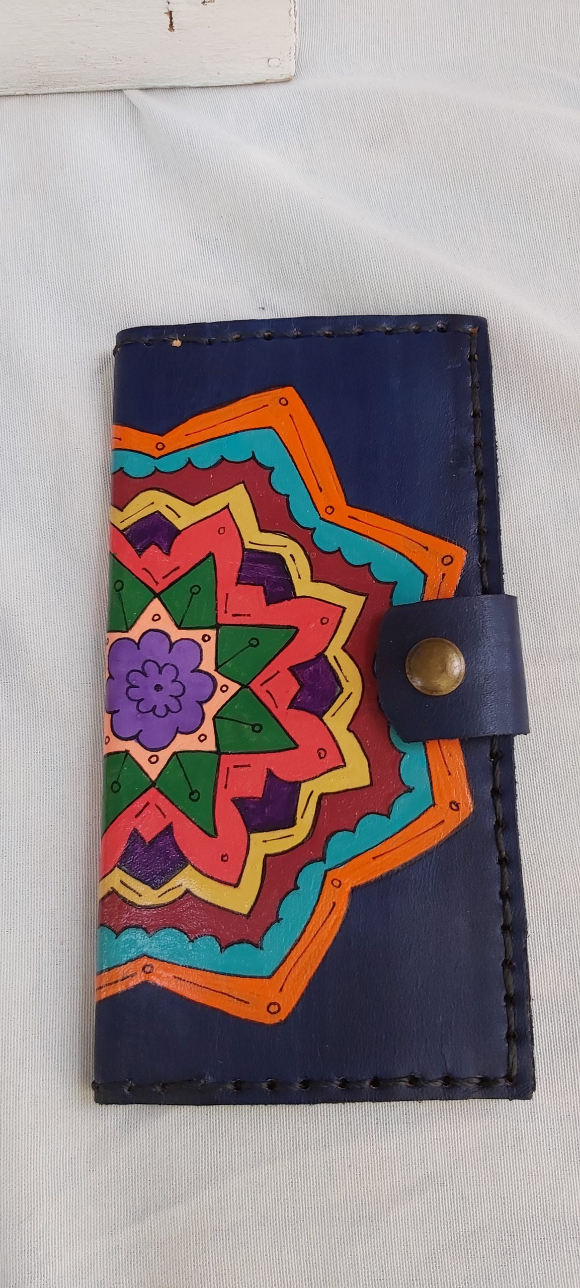 Billeteras de cuero, pintadas y decoradas con tinta y acrílicos en variados colores y diseños. Con cierre y botón a presión.