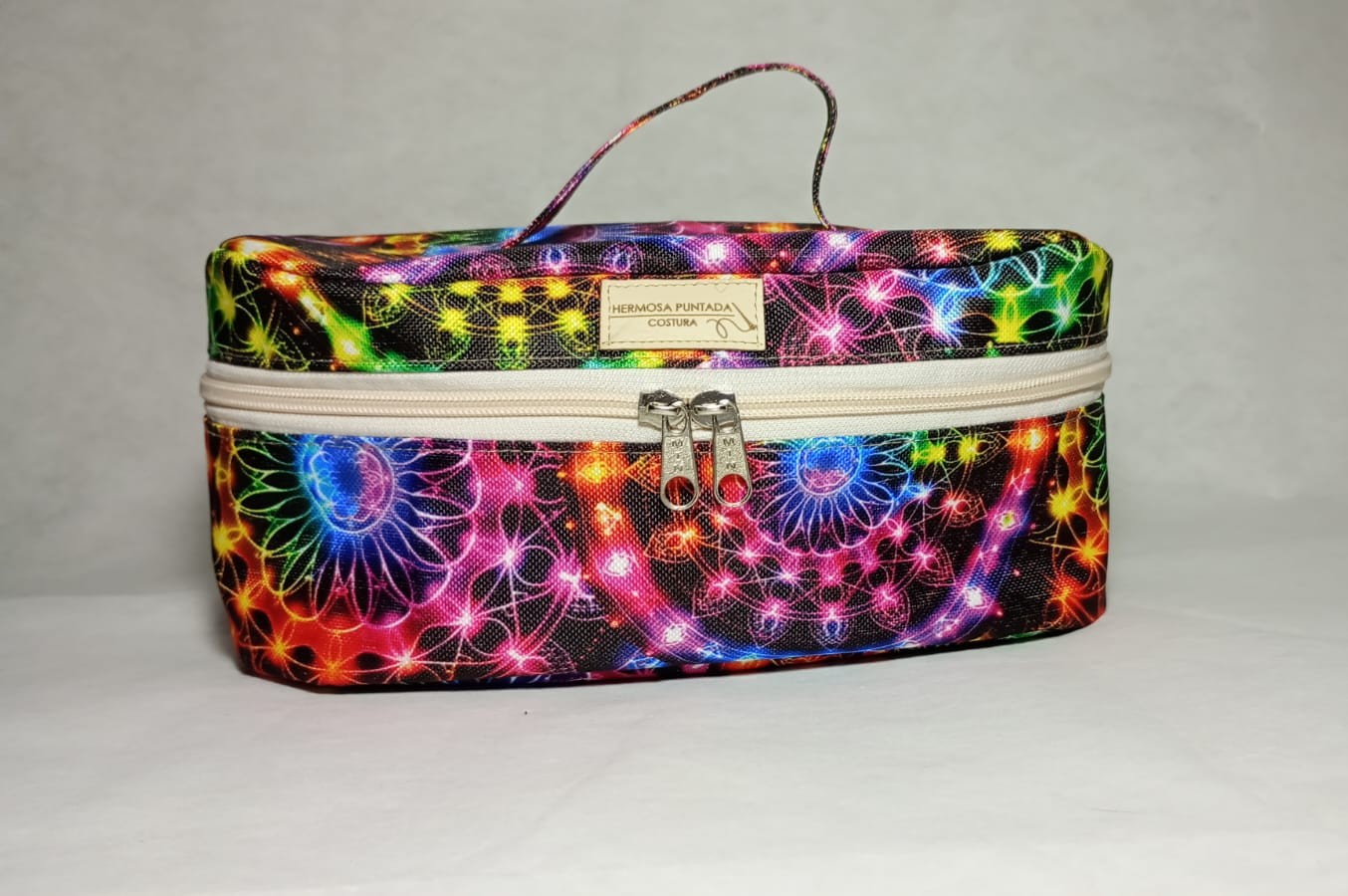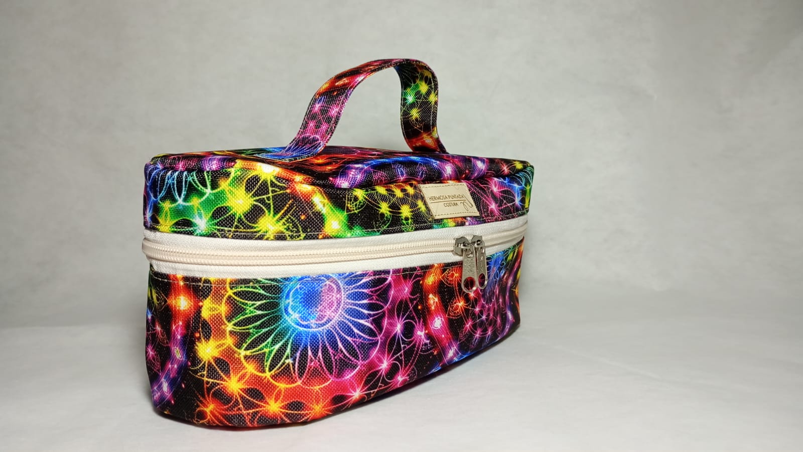 Este neceser es uno de los tamaños más grandes que realizamos (25 cm x 10 cm x 10 cm). Está confeccionado en tela de cordura y cuenta con un forro interior de nylon, lo que lo hace más resistente y duradero. Para su realización, primero se elaboran los moldes, que luego se trasladan a la tela. Las piezas se recortan, se unen con alfileres y se cosen cuidadosamente una a una. Finalmente, se agrega el cierre y la etiqueta. Como detalle final, confeccionamos una bolsa de tela vegetal para entregar el neceser, cuidando cada presentación con el mismo amor con el que fue hecho.