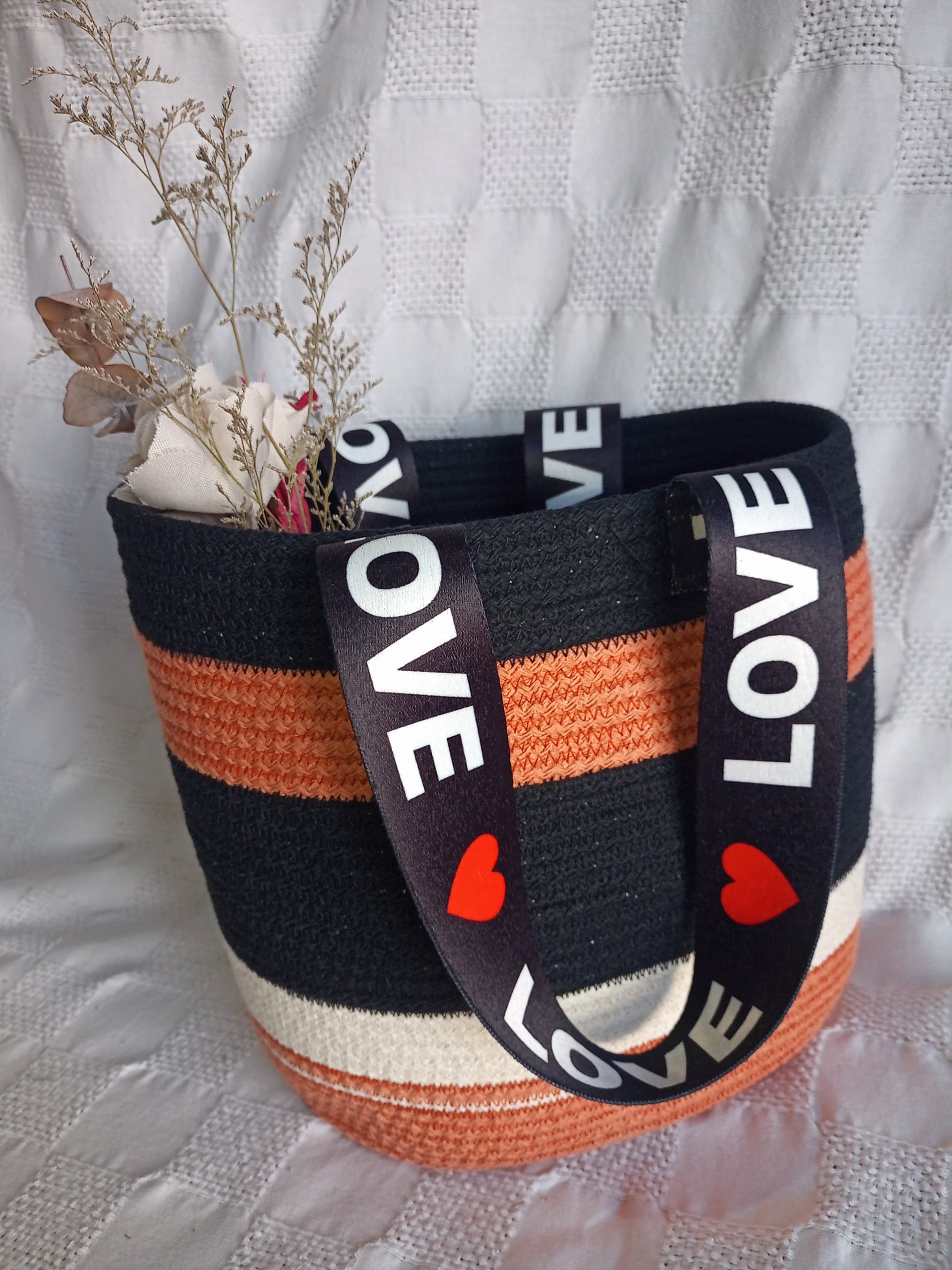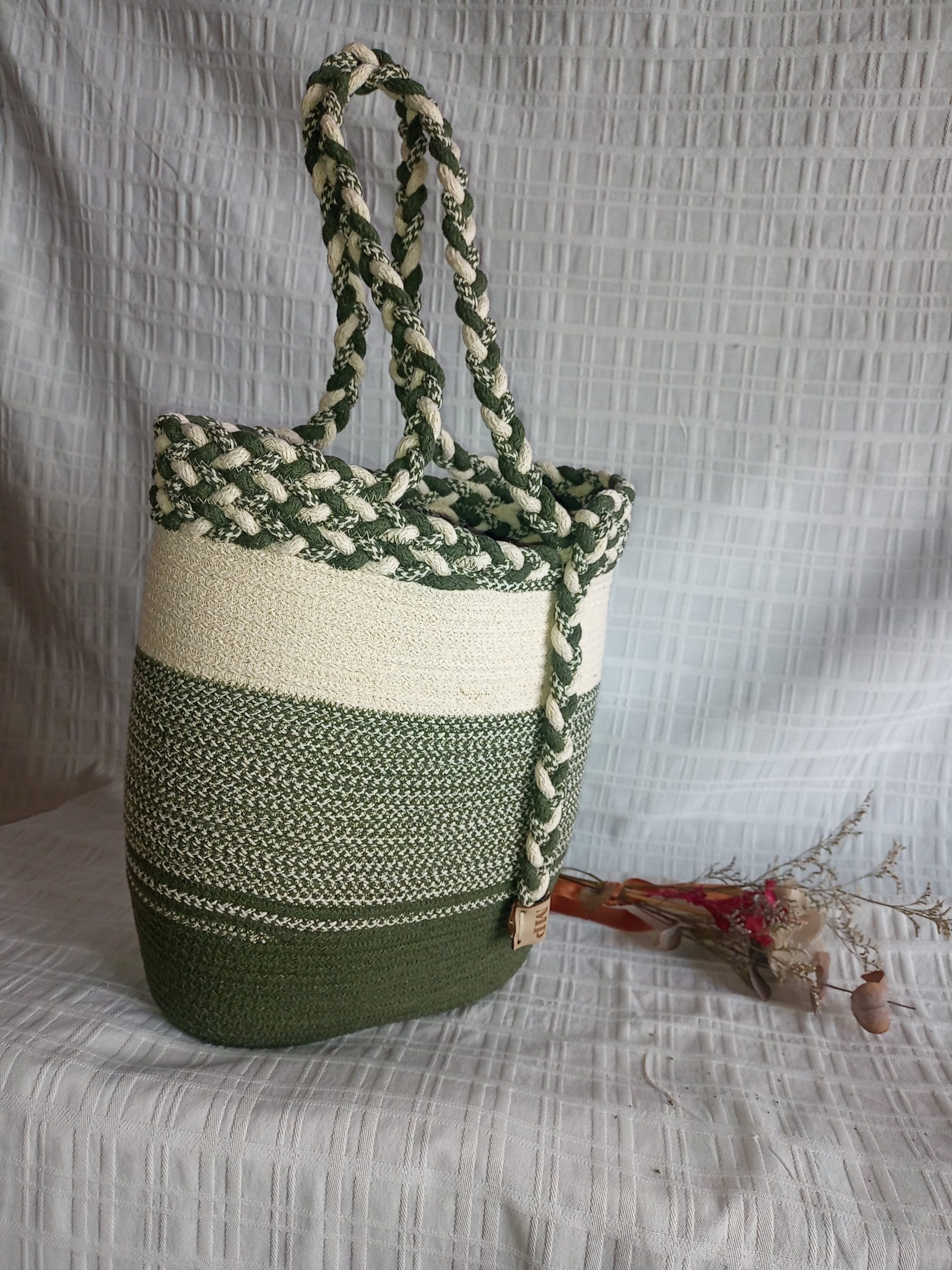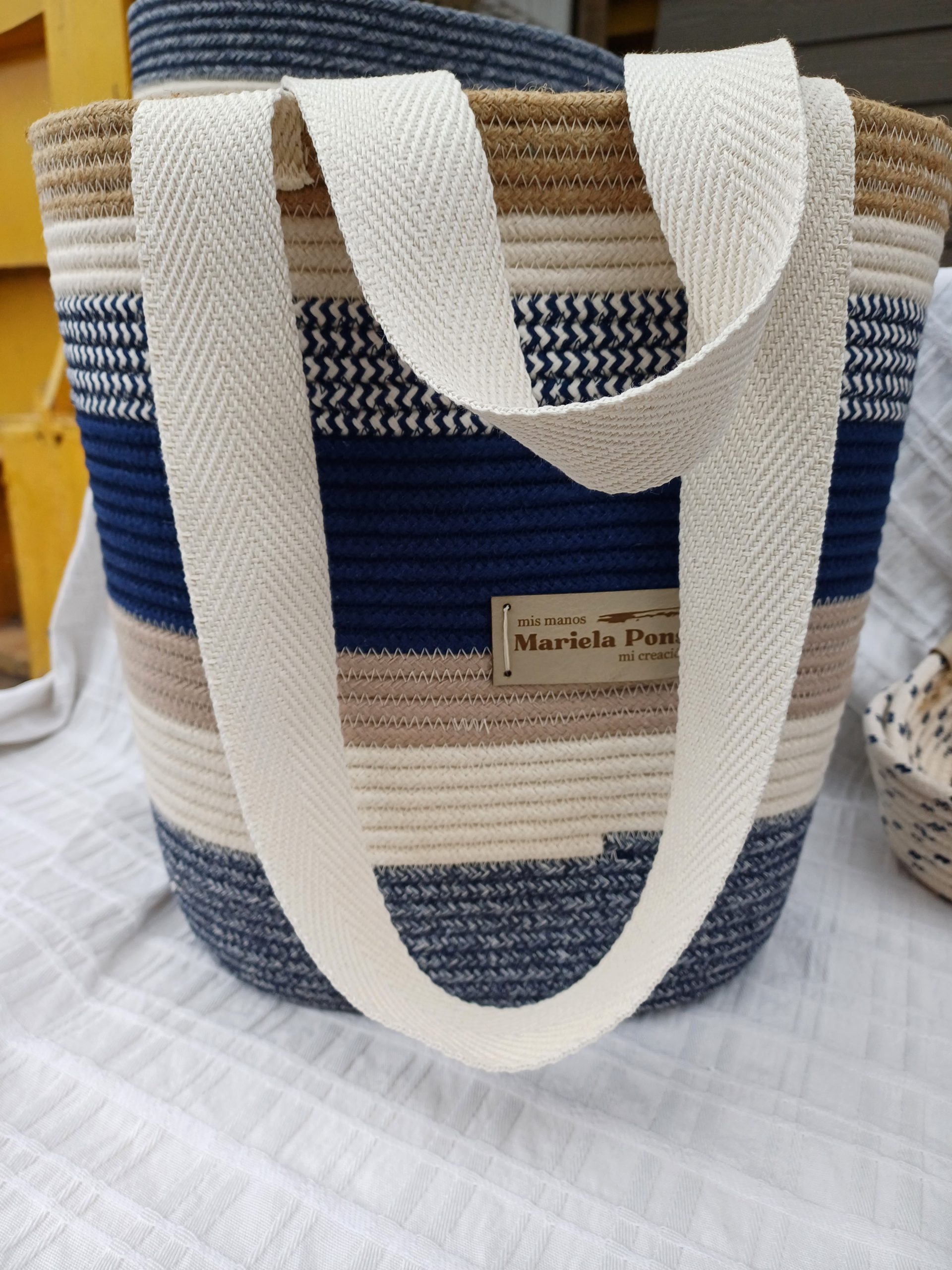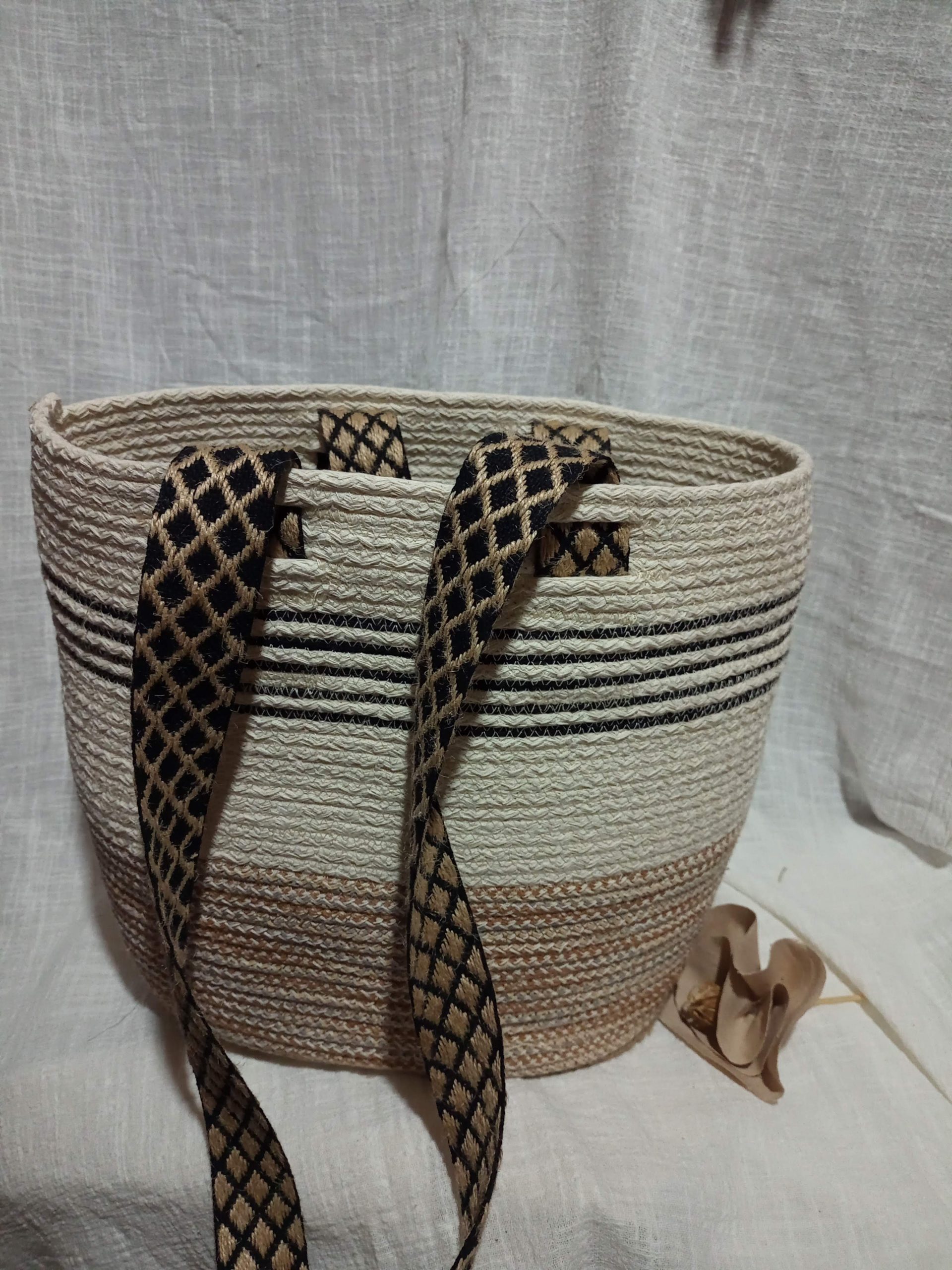 Realizado en soga de algodon / yute relleno con pabilo,cosido a maquina.De 15cm x 20 cm la base y una altura de 30cm ,ideal para matero ,bolso de playa etc