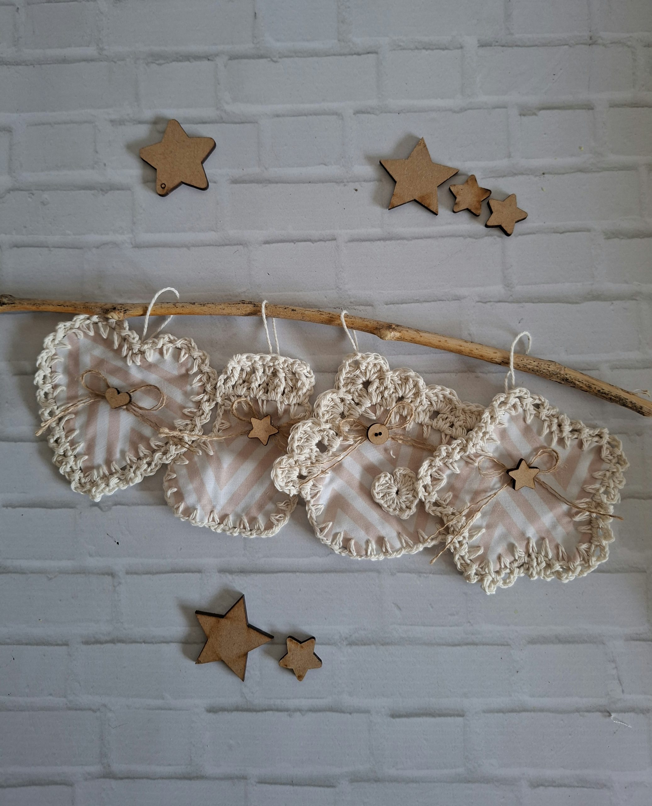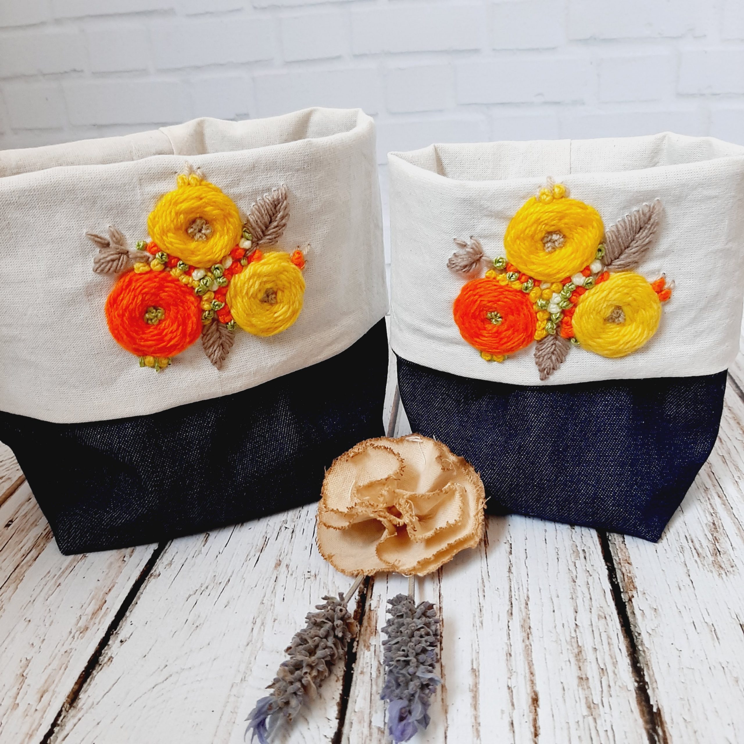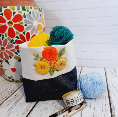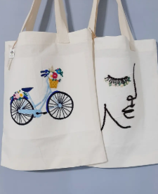 Productos decorativos bordados a mano. Se utiliza lienzo de algodón 20/20, lanas e hilos de algodón, y mostacillas, variedad de colores y grosores. En algunos productos se utiliza jean camisero. Variedad de borlas, cestos organizadores, fundas de almohadones y bolsos Por estos últimos, consultar.