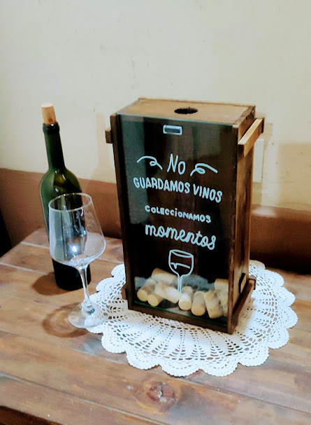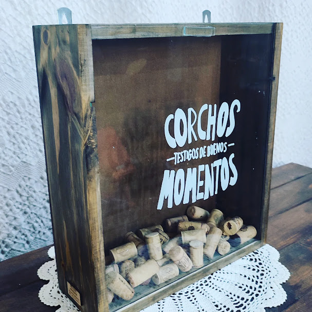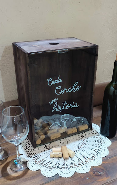Cajas para coleccionar corchos, creadas con viejos estuches de vinos. La tapa original de madera la reemplazo por vidrio deslizable para vaciar y volver a llenar.