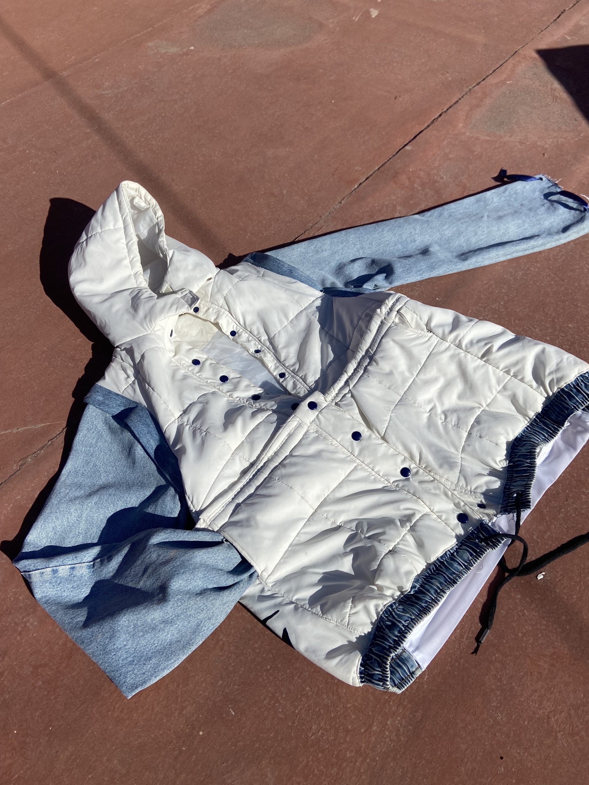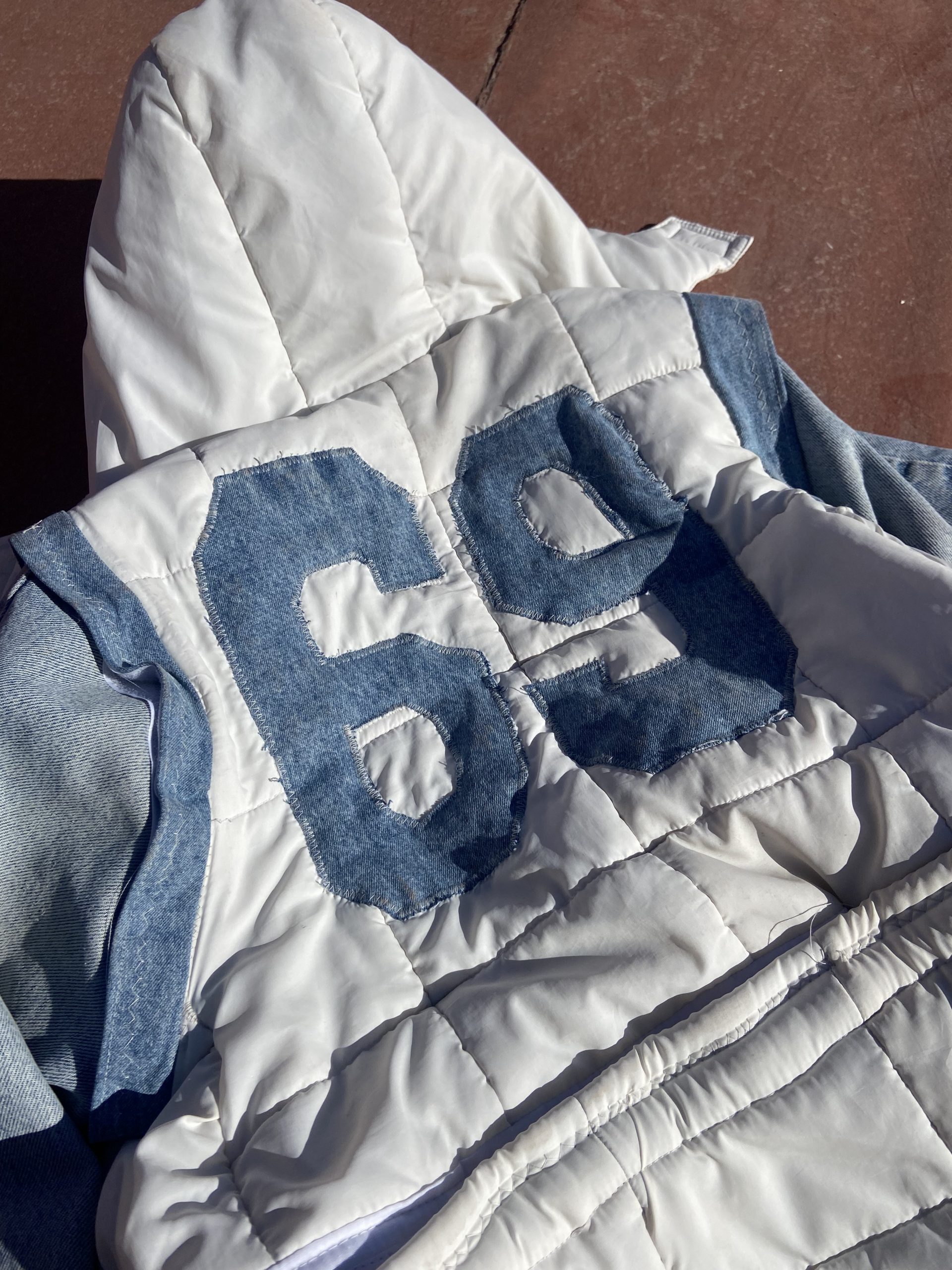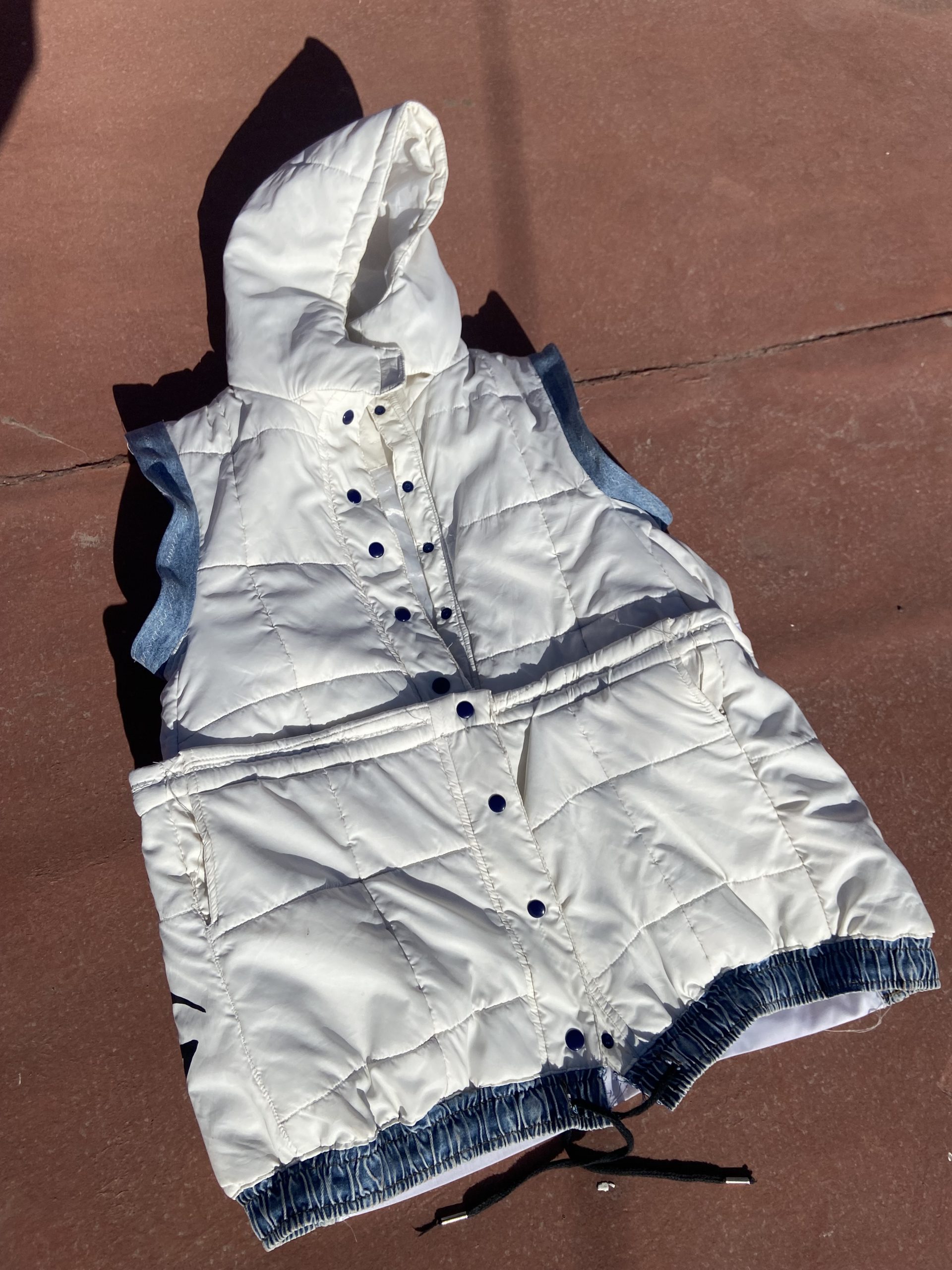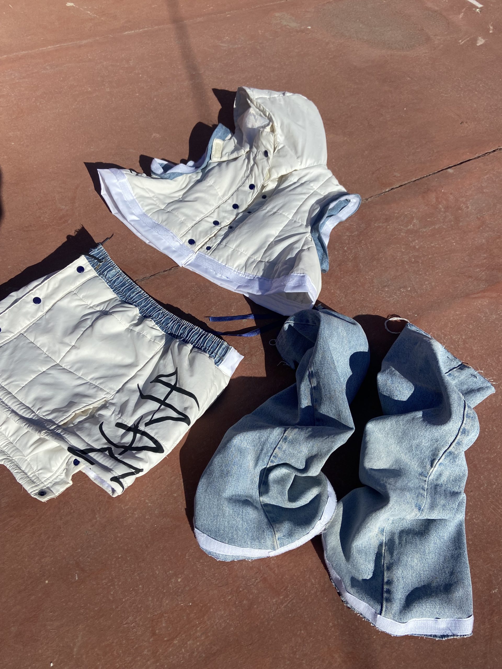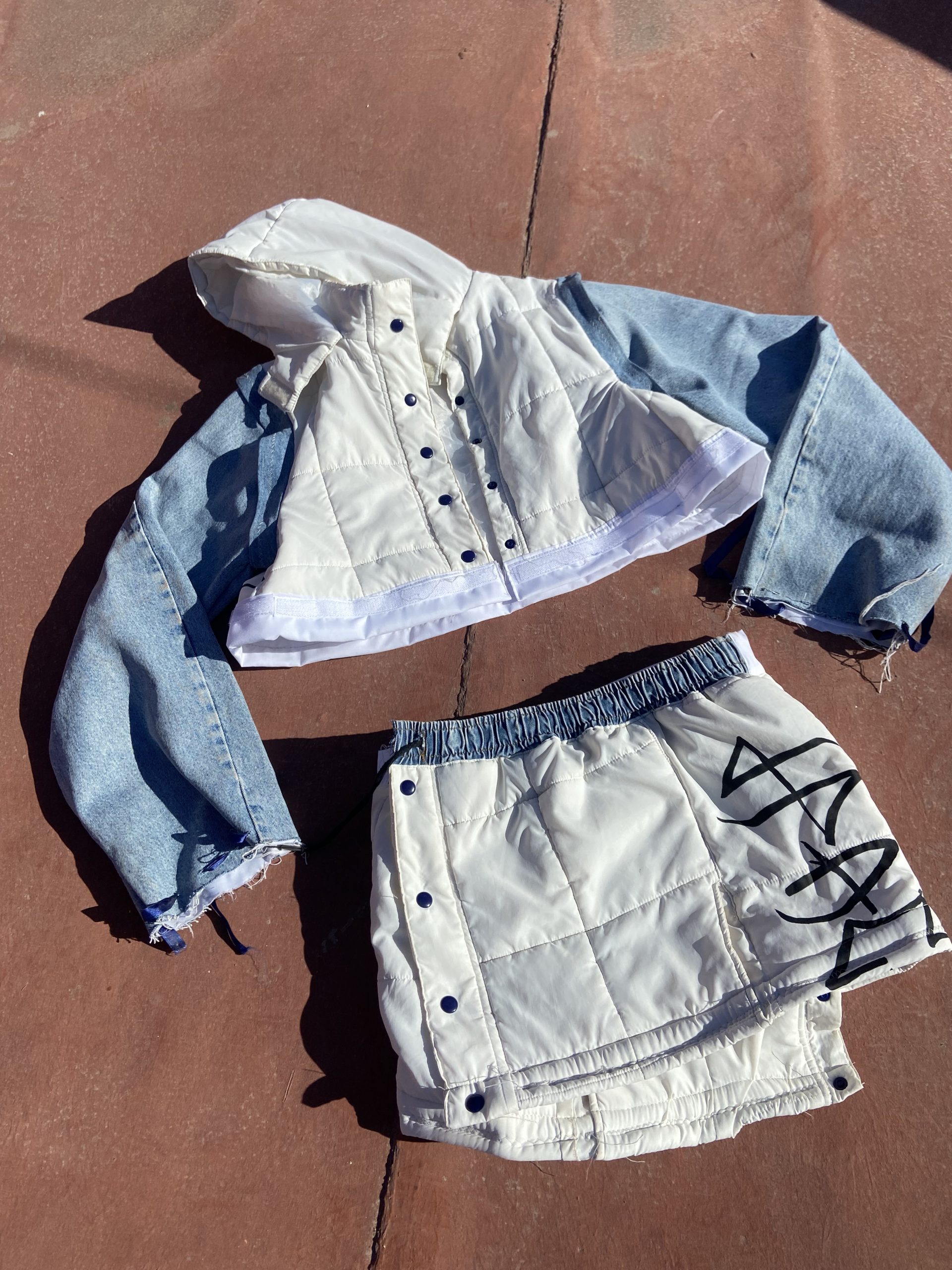 Esta es una campera con 6 usos y 3 piezas. Esta hecha a partir de una campera de niño talle 14, se transformó para que tenga un corte bomber y se le agregó denim. Las mangas son desmontables siendo asi, se transforma en chaleco, y en la mitad tambien se desmonta haciéndose chaleco crop o campera crop. A su misma vez, la parte de abajo se hace falda, por lo cual tendríamos un set de tres piezas, chaleco crop, falda, y las mangas se hacen polainas.
