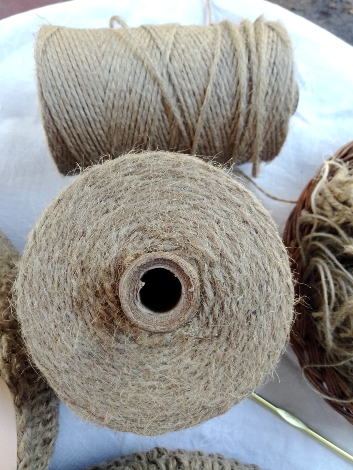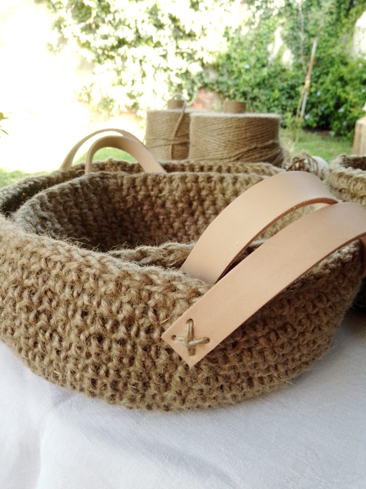 Canastas de diversos tamaños, hechas a crochet con yute y manijas de cuero