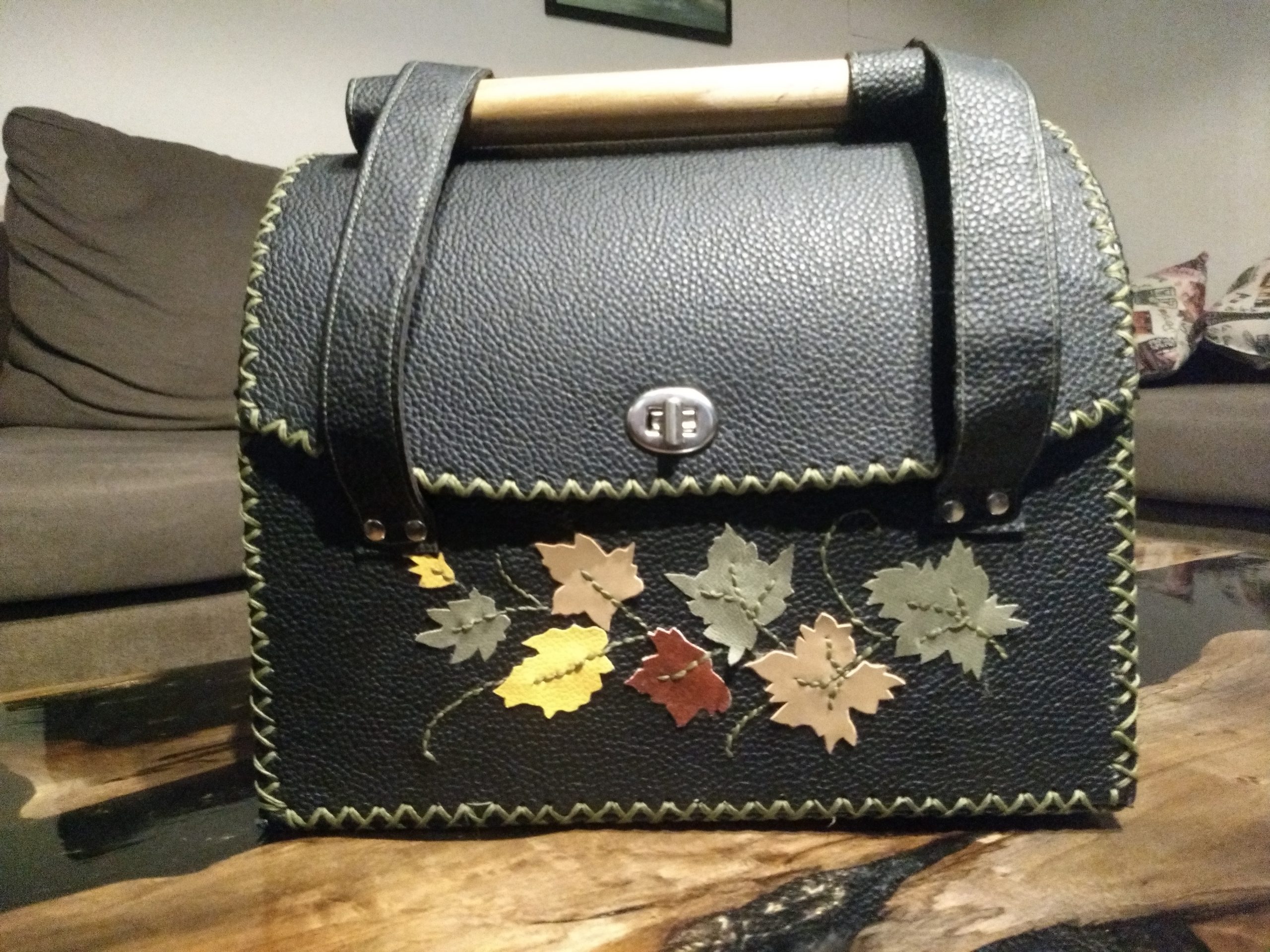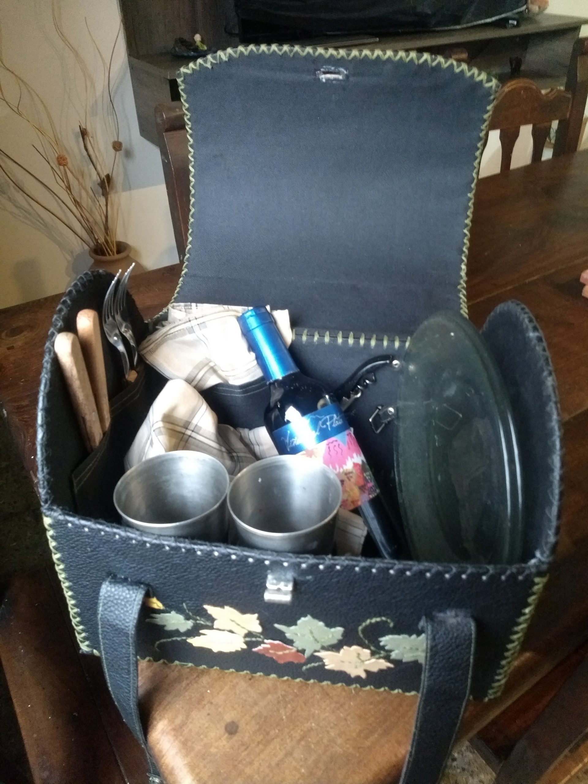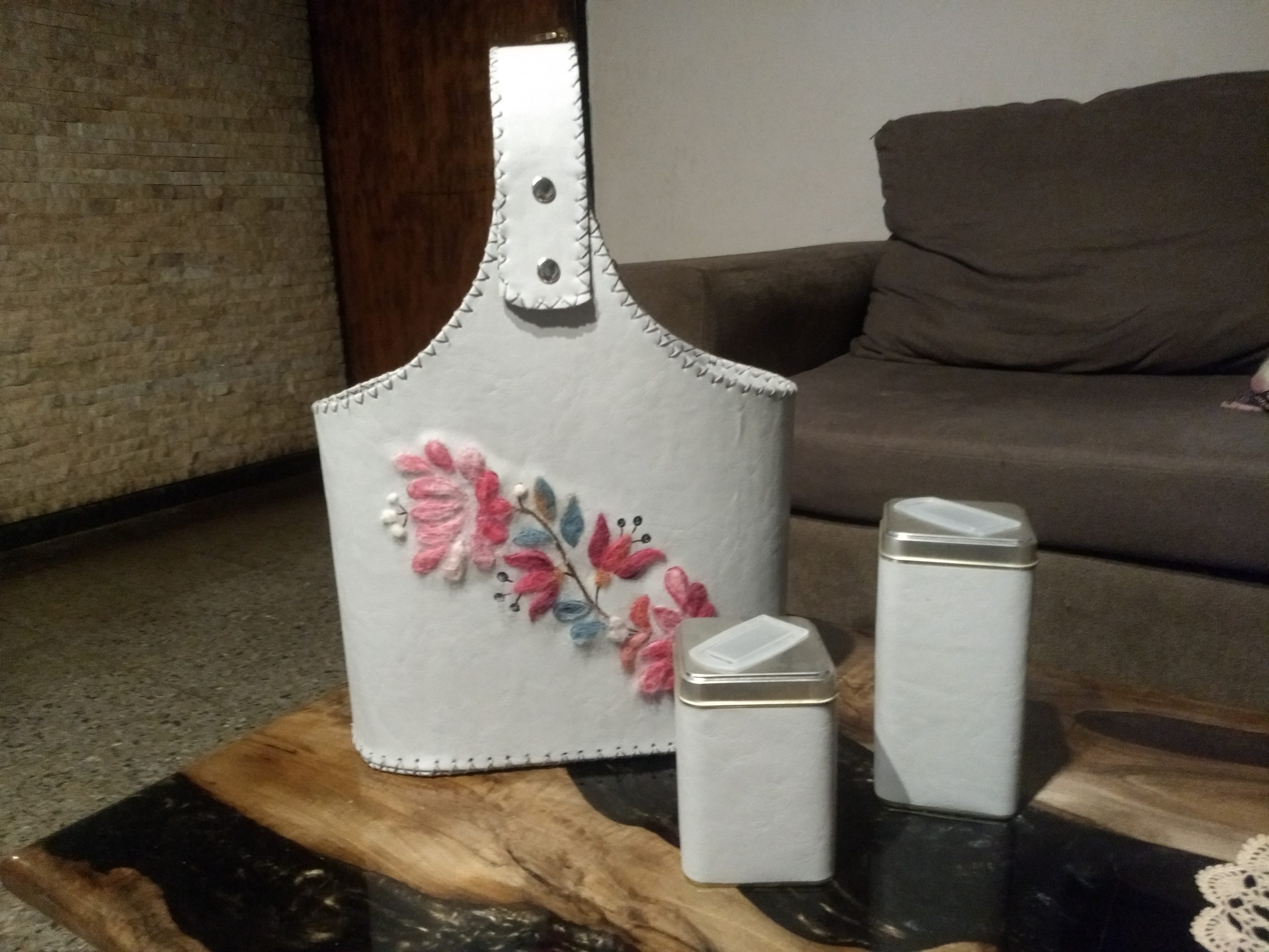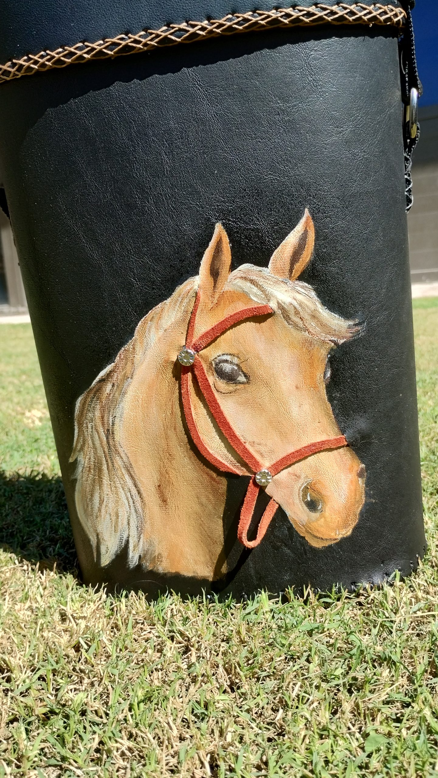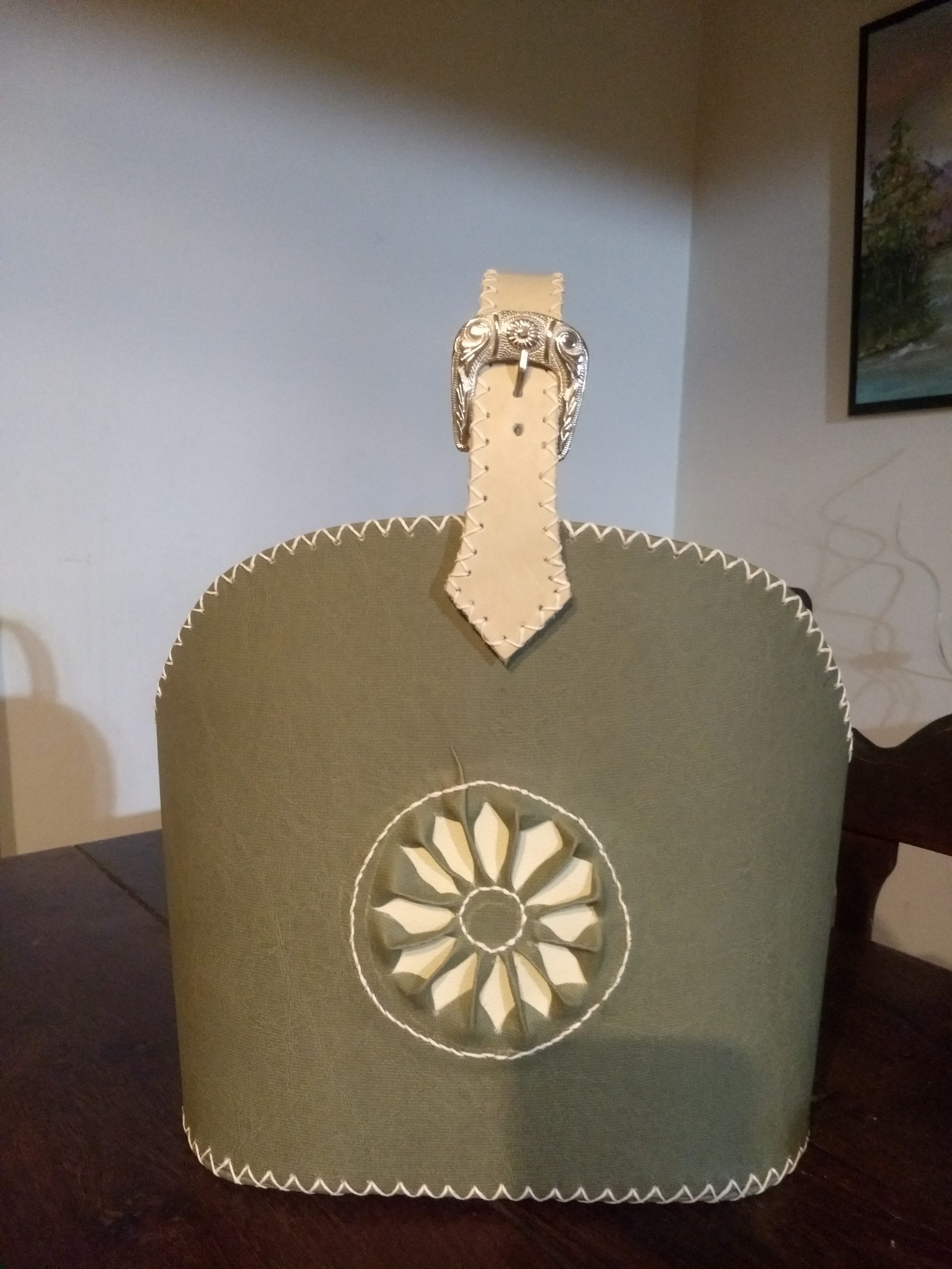 Matero rígido cosido a mano con hilo de cera, realizado en cuero ecológico y forrado en el mismo material, pintado a mano alzada, con aplicación de tiento y tachas; forrado en el mismo material lo que permite mayor higiene. La correa es en cinta mochilera al tono, con deslizador para ajustar el largo de la misma. En su parte inferior lleva cuatro patitas de apoyo. Los avíos y herrajes son metálicos.