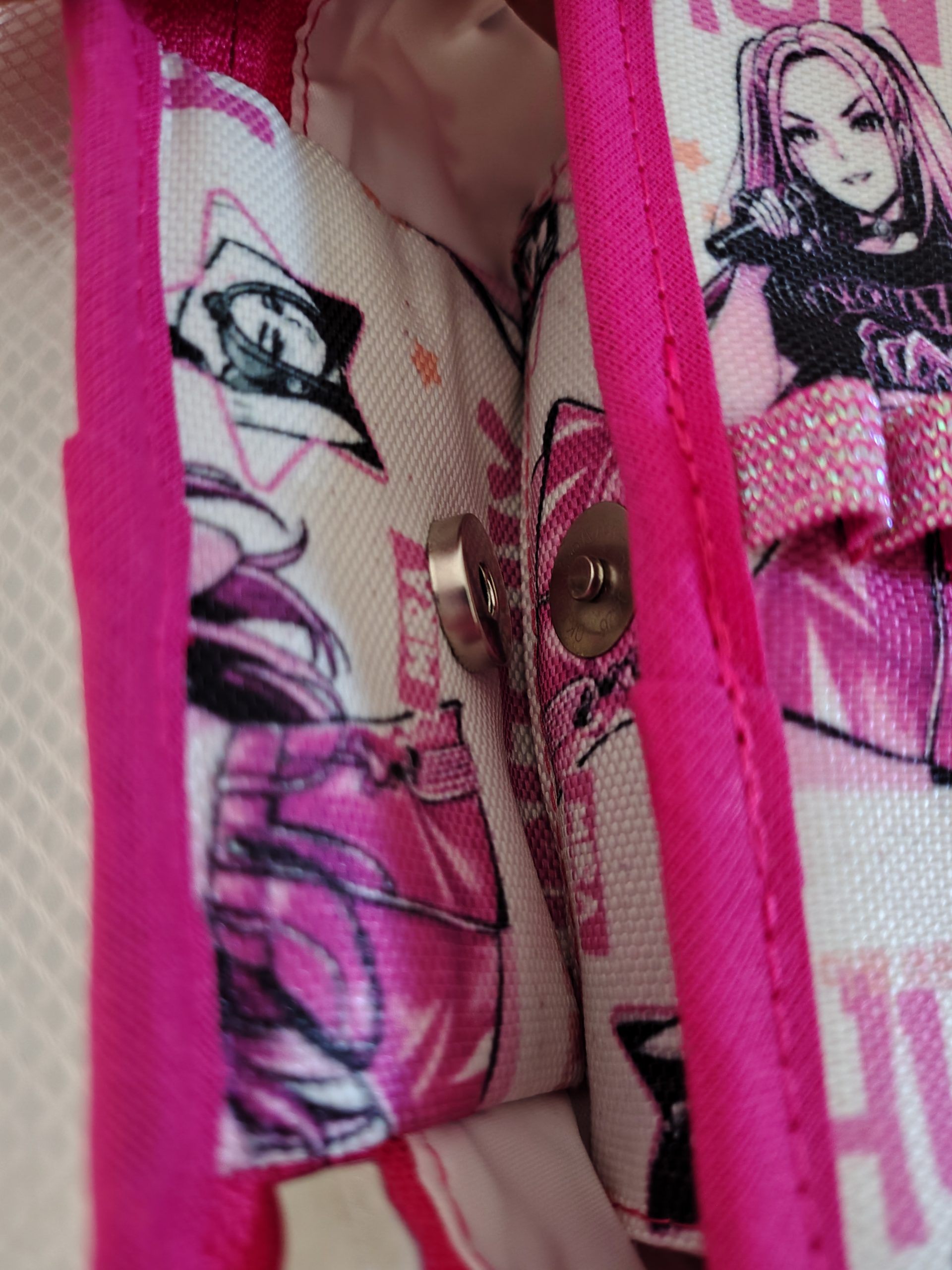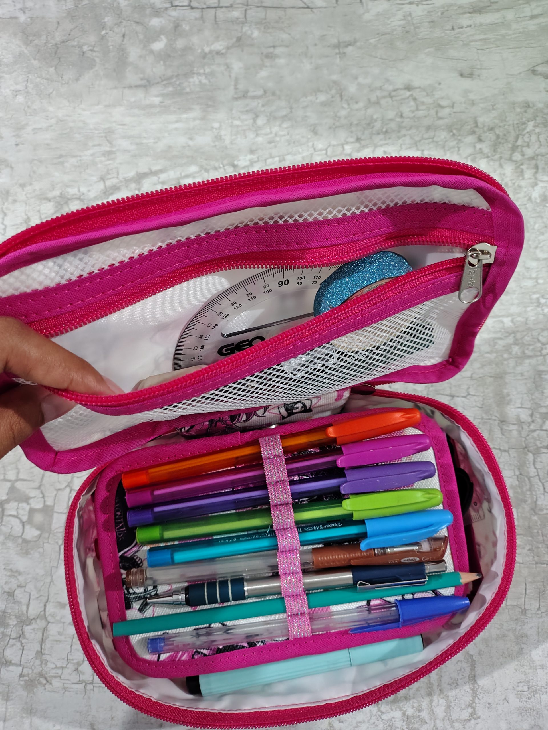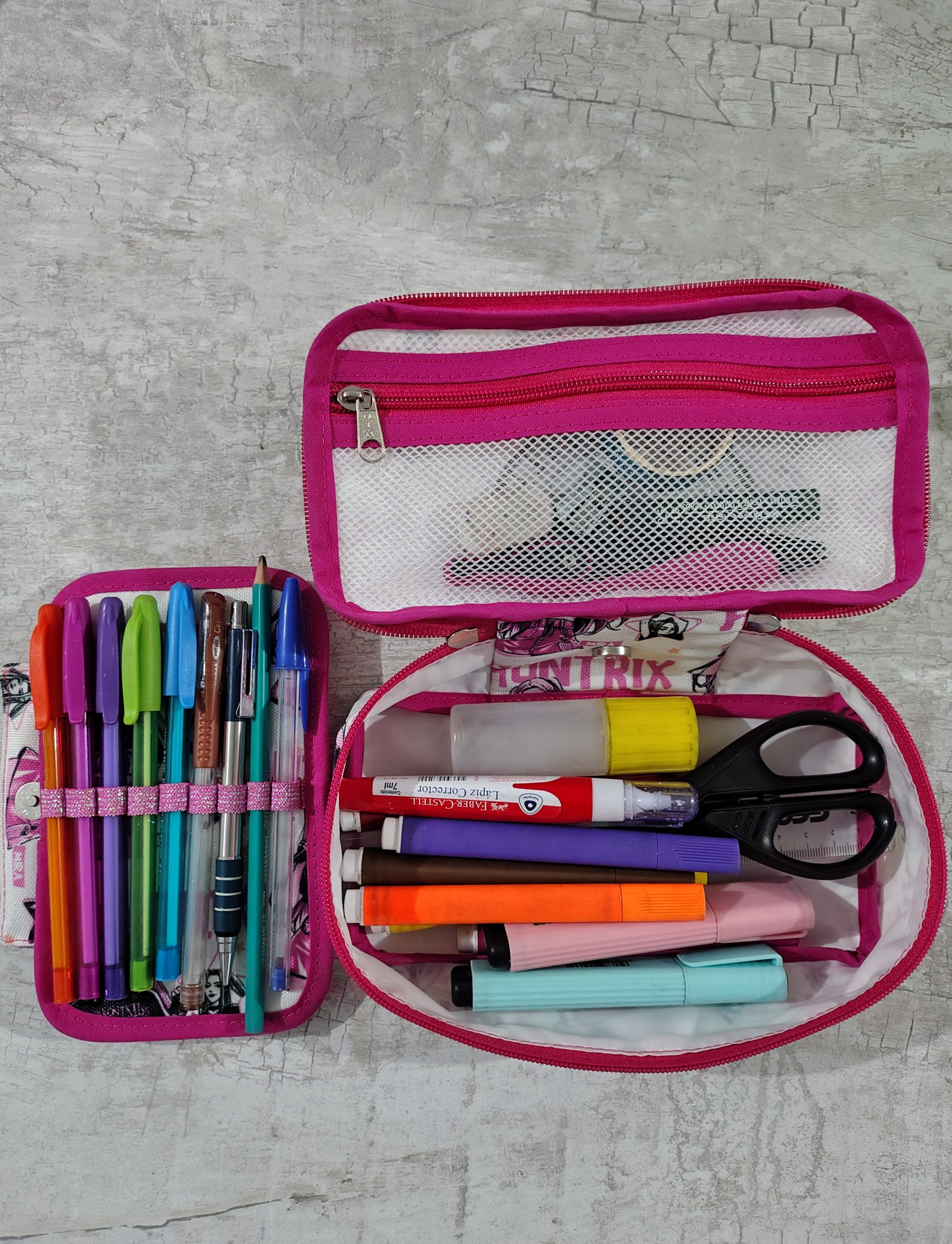 Cuenta con un bolsillo en red con cierre para guardar tus útiles y un portalápices desmontable gracias a su broche imán con separadores en elástico.