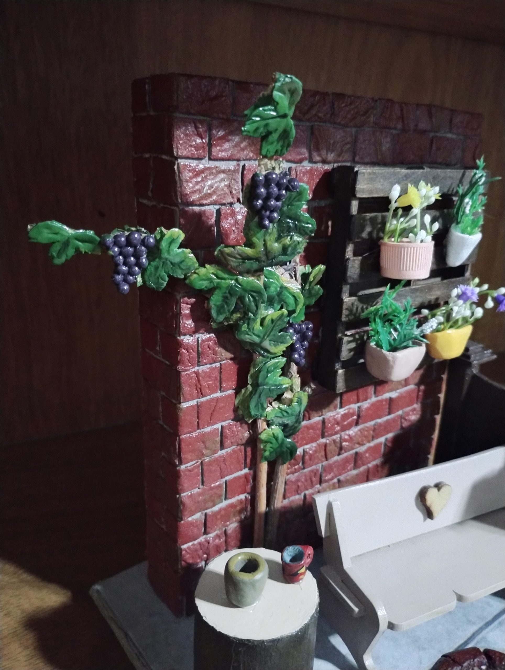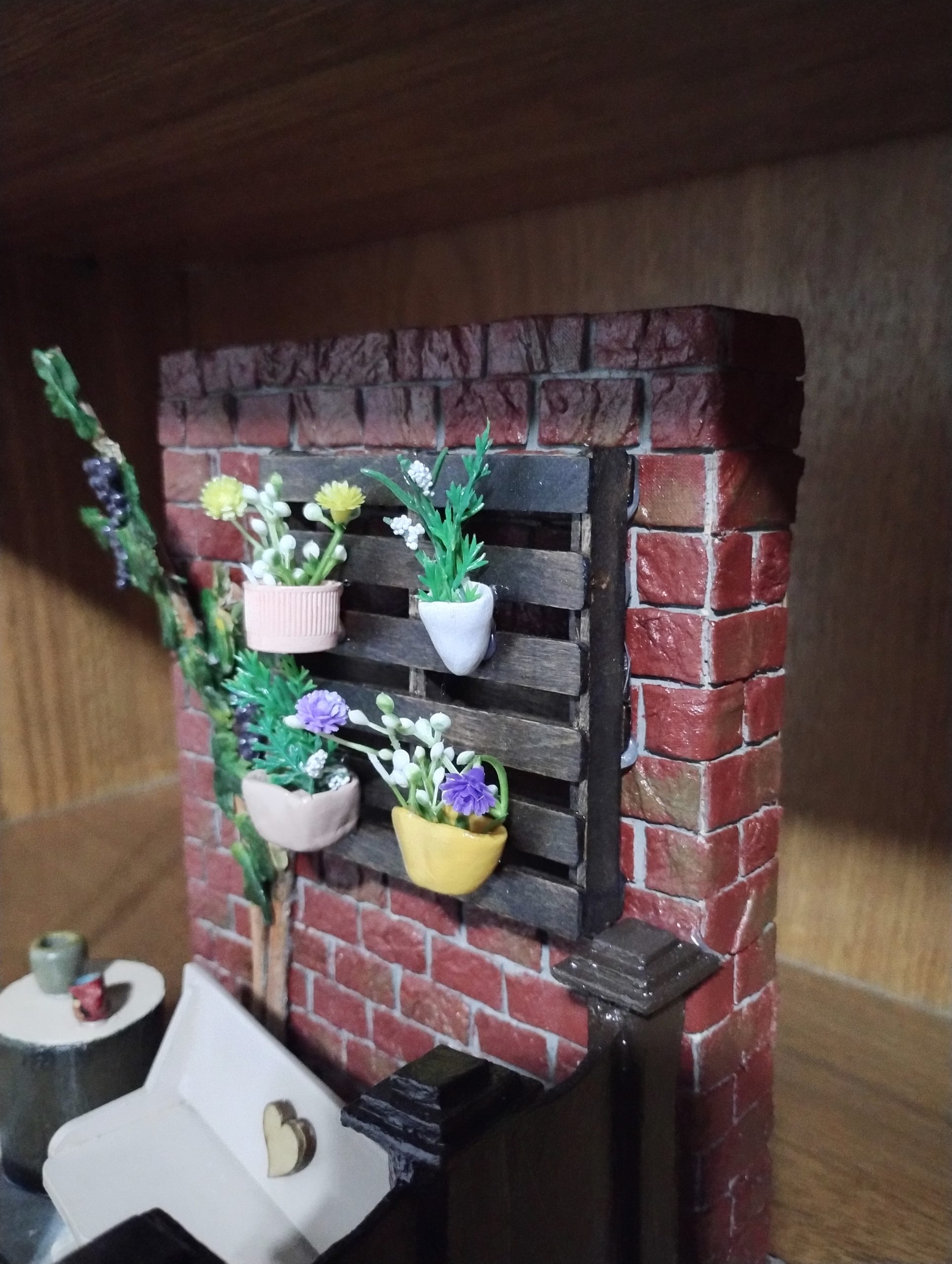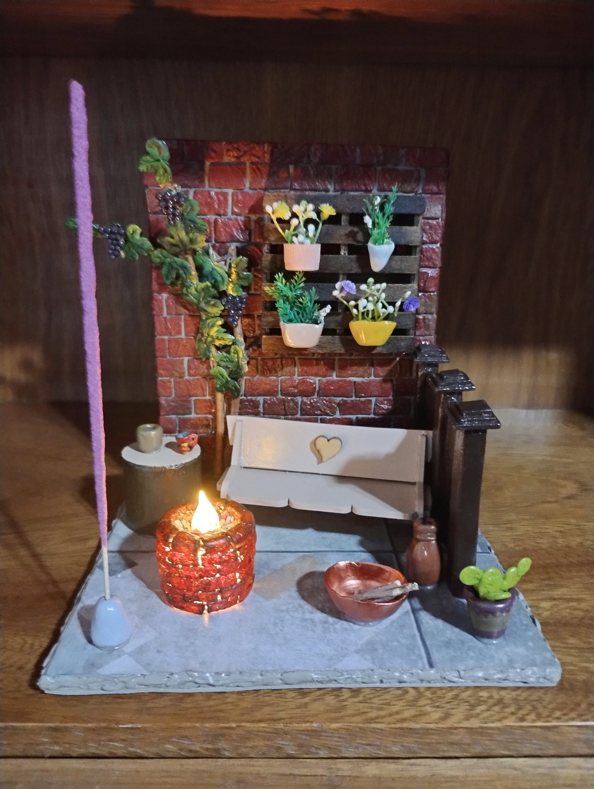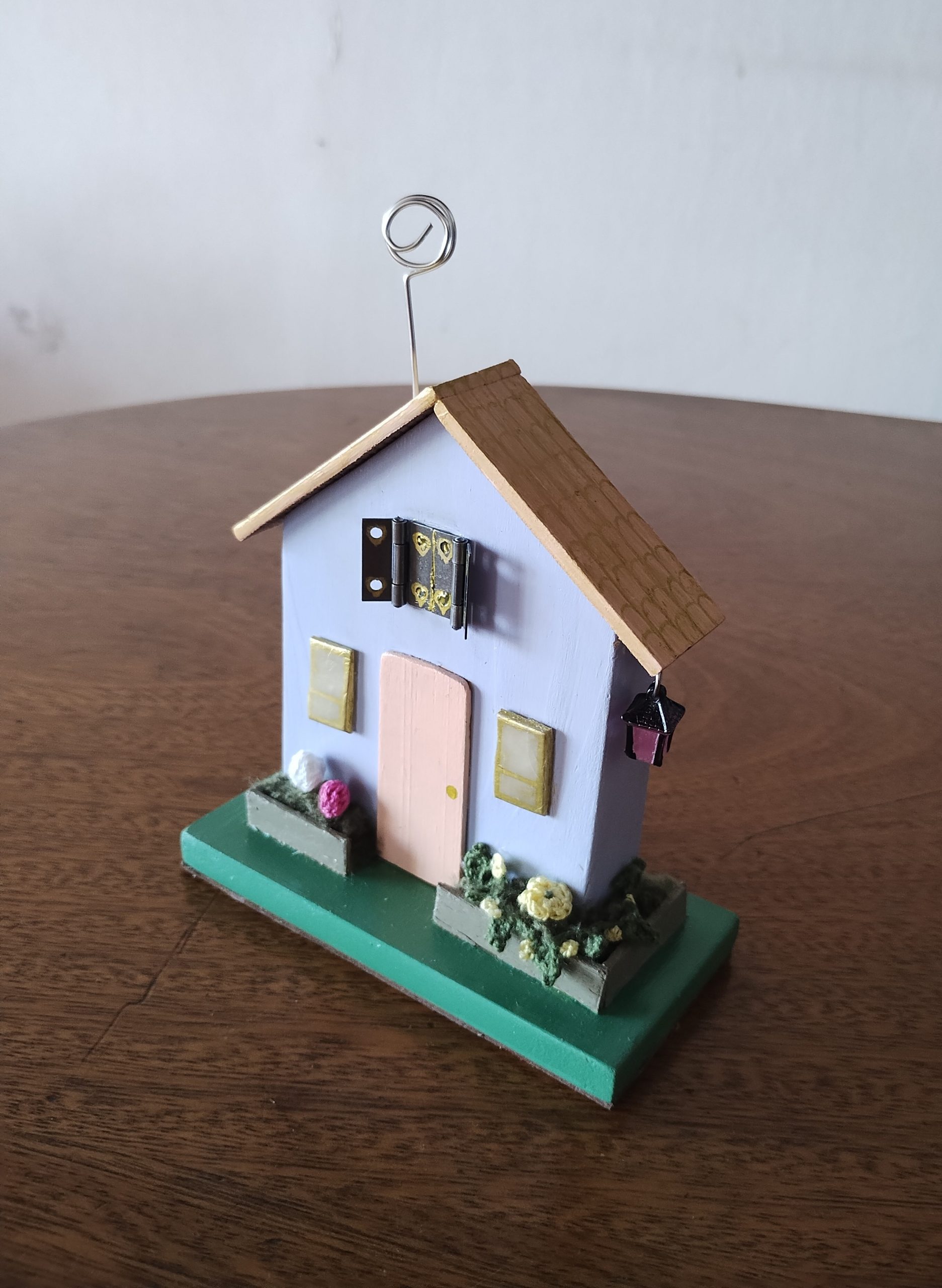 Realizada en madera, muestra un pequeño jardín con plantas tejidas. Cuenta con accesorio para sujetar tarjeta, anotación, etc. Medidas aprox. 15 x 15 x 7 cm