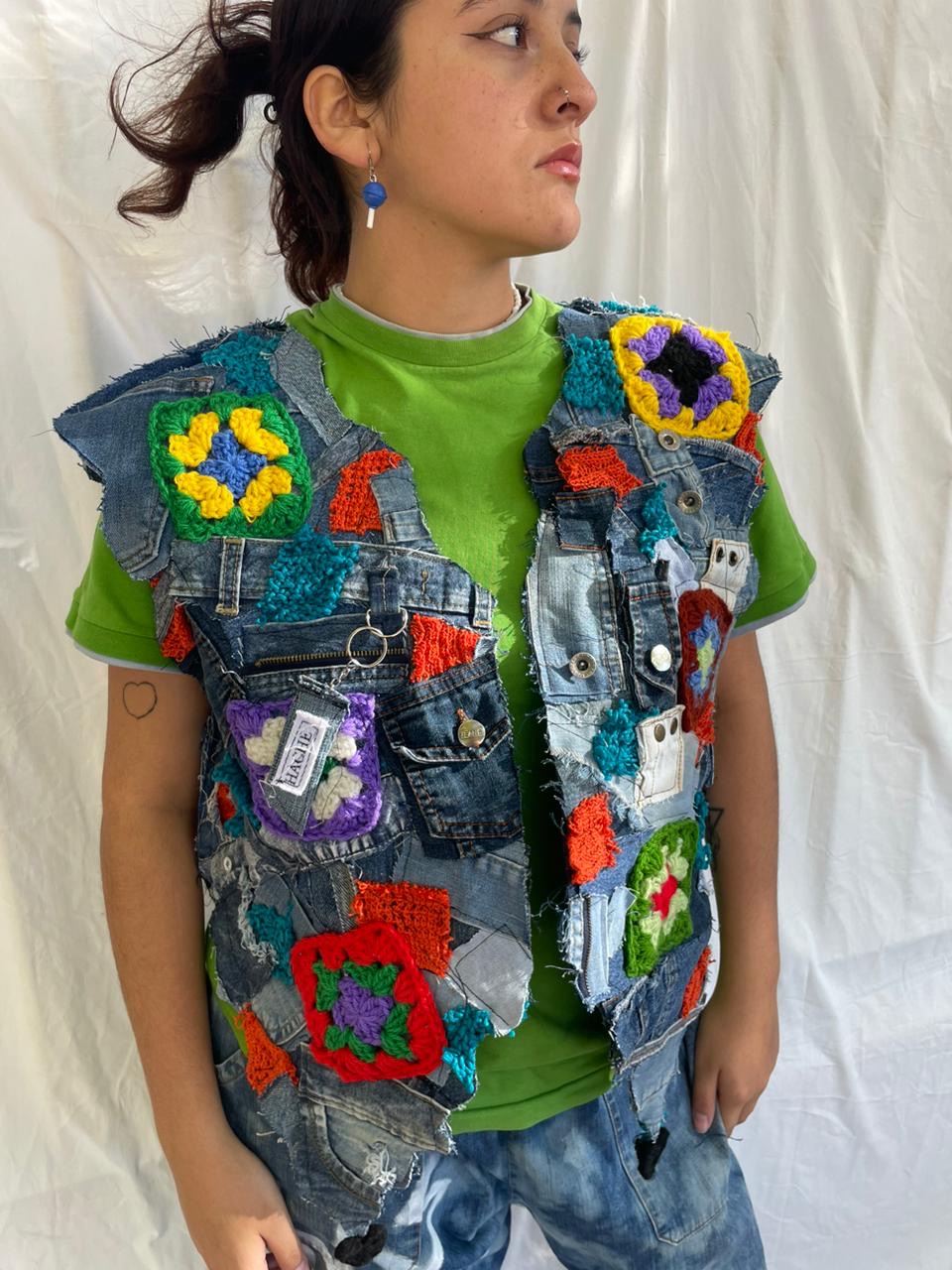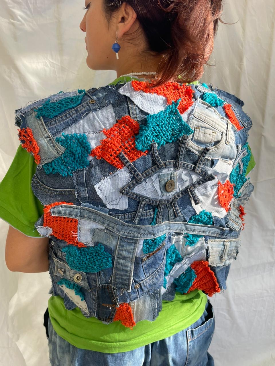 Chaleco hecho a partir de residuos de proyectos anteriores. En la zona de la espalda cuenta con una técnica llamada mosaico texti. El material utilizado es denim y tejidos a crochet, su talle es un XL.