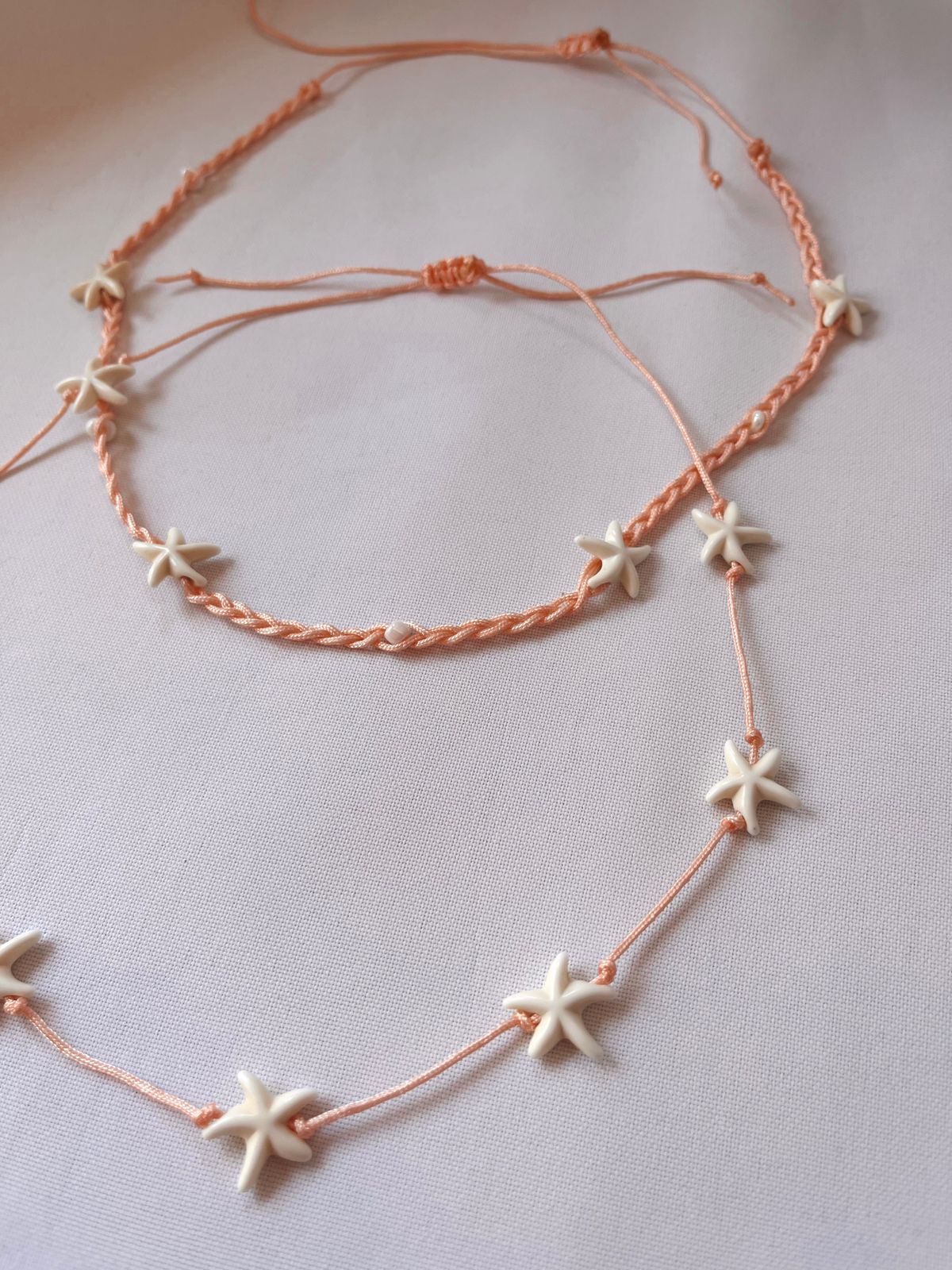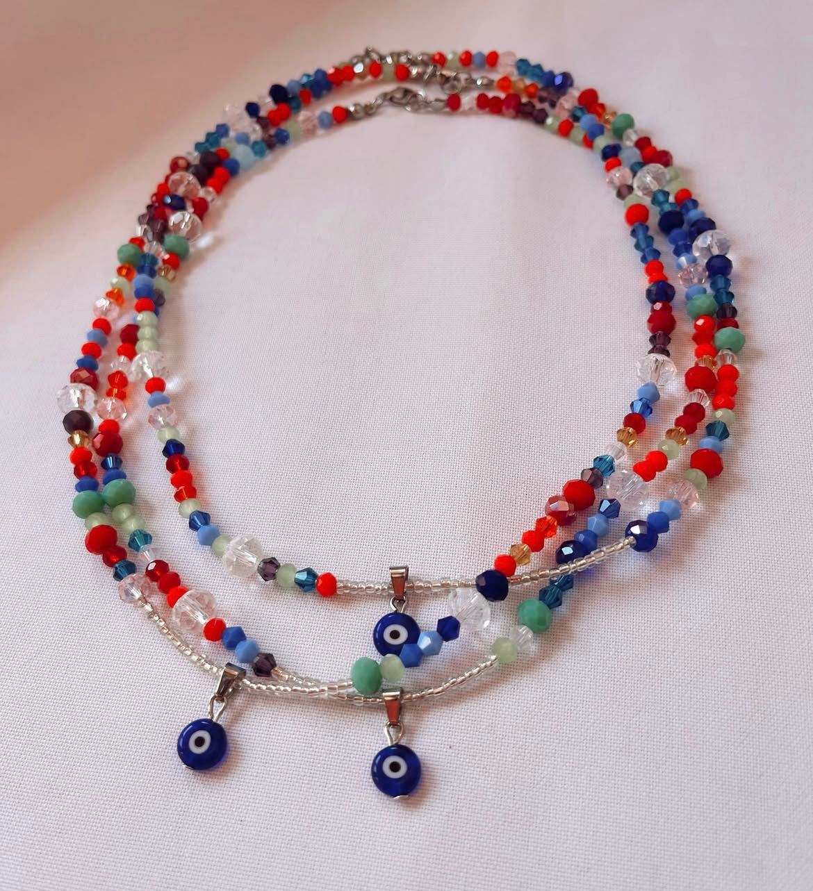 Tengo varios modelos de collares, con cristales o de macrame con hilo chino. Para hacer los de cristales utilizo alambre, tapa nudos, mosquetones, cristales y dijes. Primero empiezo con el cierre, con el tapa nudo, luego le coloco los cristales y los dijes, y por ultimo le coloco el otro tapa nudo, ya para finalizar le agrego unas argollas y el mosquetón. Para hacer el collar de macrame es muy parecido el proceso de las pulseras, la diferencia es que utilizo mas material, mas hilos, mas dijes y mostacillas. Comienzo formando el tejido base mediante nudos de macramé, lo que aporta firmeza y prolijidad. En los modelos que incluyen mostacillas u ojos turcos, los ensarto en el hilo siguiendo el diseño elegido. Finalmente, ajusto los extremos mediante un cierre corredizo o nudo regulable, permitiendo adaptar la pulsera a distintas medidas.