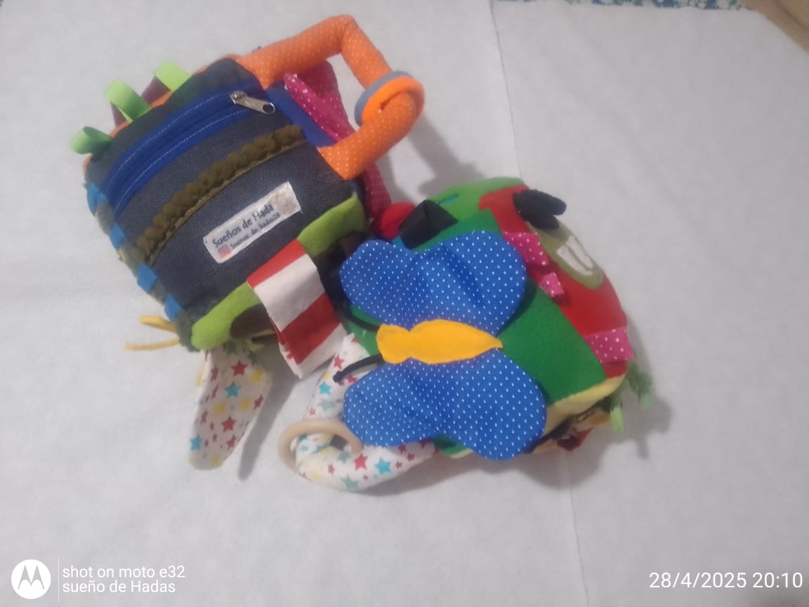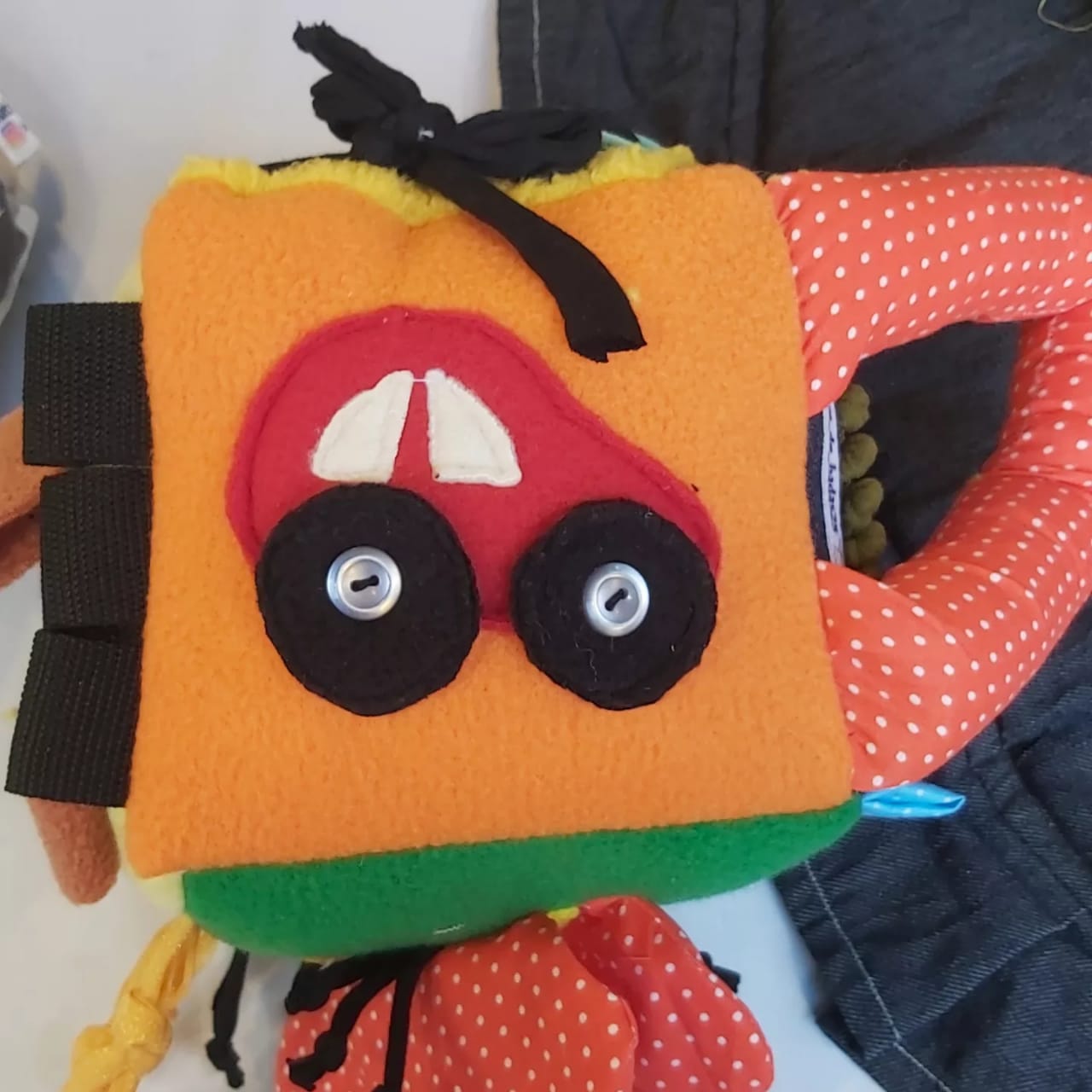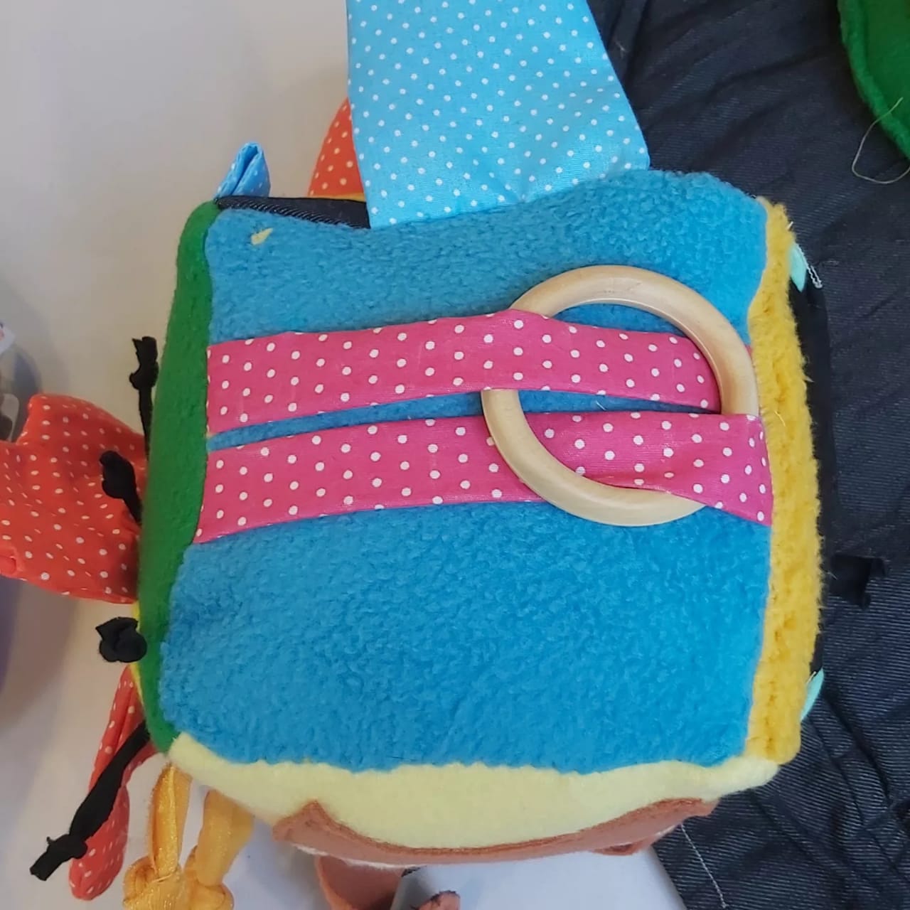Es un juguete; ideal para que los bebes/niños puedan explorar. Cada cara del cubo posee un diseño y una propuesta distinta. Es un juguete educativo, está diseñado para captar la atención de niño mediante diferentes texturas, colores, formas, y sonidos, estimulando así su sentido del tacto, vista y el oído. Este proceso de exploración ayuda al niño a desarrollar habilidades motoras finas, mejorar su coordinación ojo-mano y fomentar su capacidad de concentración. Contiene 6 actividades más agarre y tiras de laterales. Ideal para bebes a partir de los 6 meses hasta los 4/5 años. Materiales: Telas de diferentes texturas, vellón siliconado, abrojos, sonajero, cierres, materiales reciclados, argolla de madera. Técnica: Máquina de coser y costura a mano. Tamaño: 15cm x 15cm. Color: Multicolor. Se puede lavar en el lavarropas (en funda)