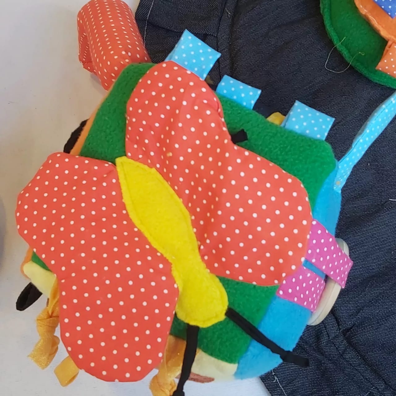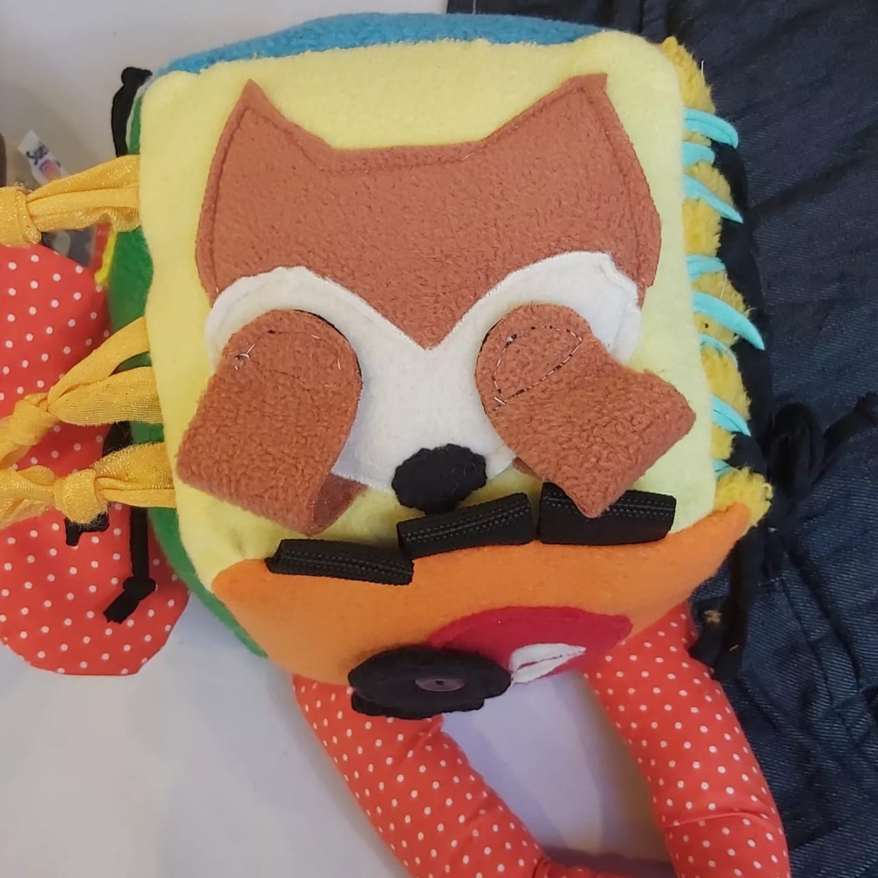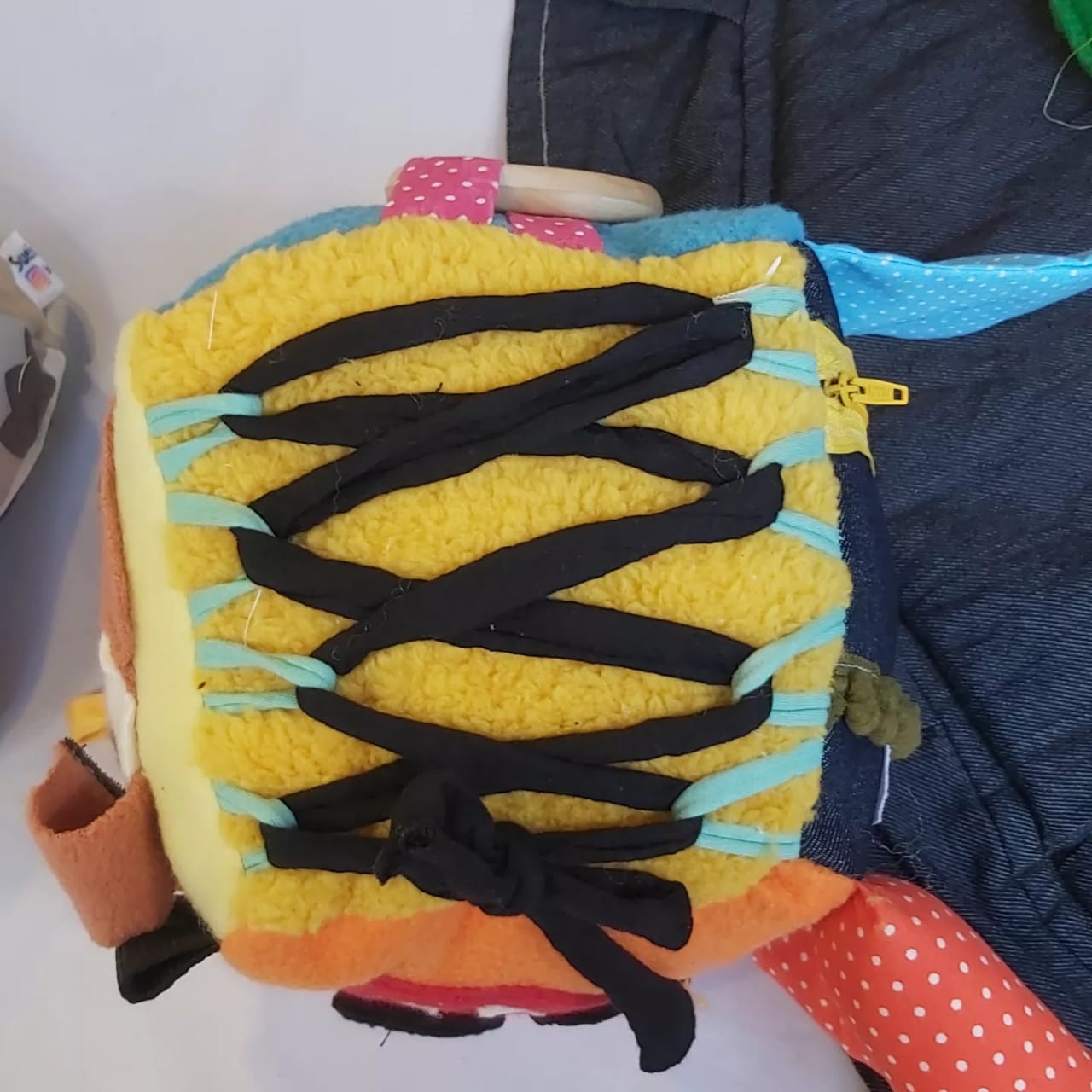 Es un juguete; ideal para que los bebes/niños puedan explorar. Cada cara del cubo posee un diseño y una propuesta distinta. Es un juguete educativo, está diseñado para captar la atención de niño mediante diferentes texturas, colores, formas, y sonidos, estimulando así su sentido del tacto, vista y el oído. Este proceso de exploración ayuda al niño a desarrollar habilidades motoras finas, mejorar su coordinación ojo-mano y fomentar su capacidad de concentración. Contiene 6 actividades más agarre y tiras de laterales. Ideal para bebes a partir de los 6 meses hasta los 4/5 años. Materiales: Telas de diferentes texturas, vellón siliconado, abrojos, sonajero, cierres, materiales reciclados, argolla de madera. Técnica: Máquina de coser y costura a mano. Tamaño: 15cm x 15cm. Color: Multicolor. Se puede lavar en el lavarropas (en funda)