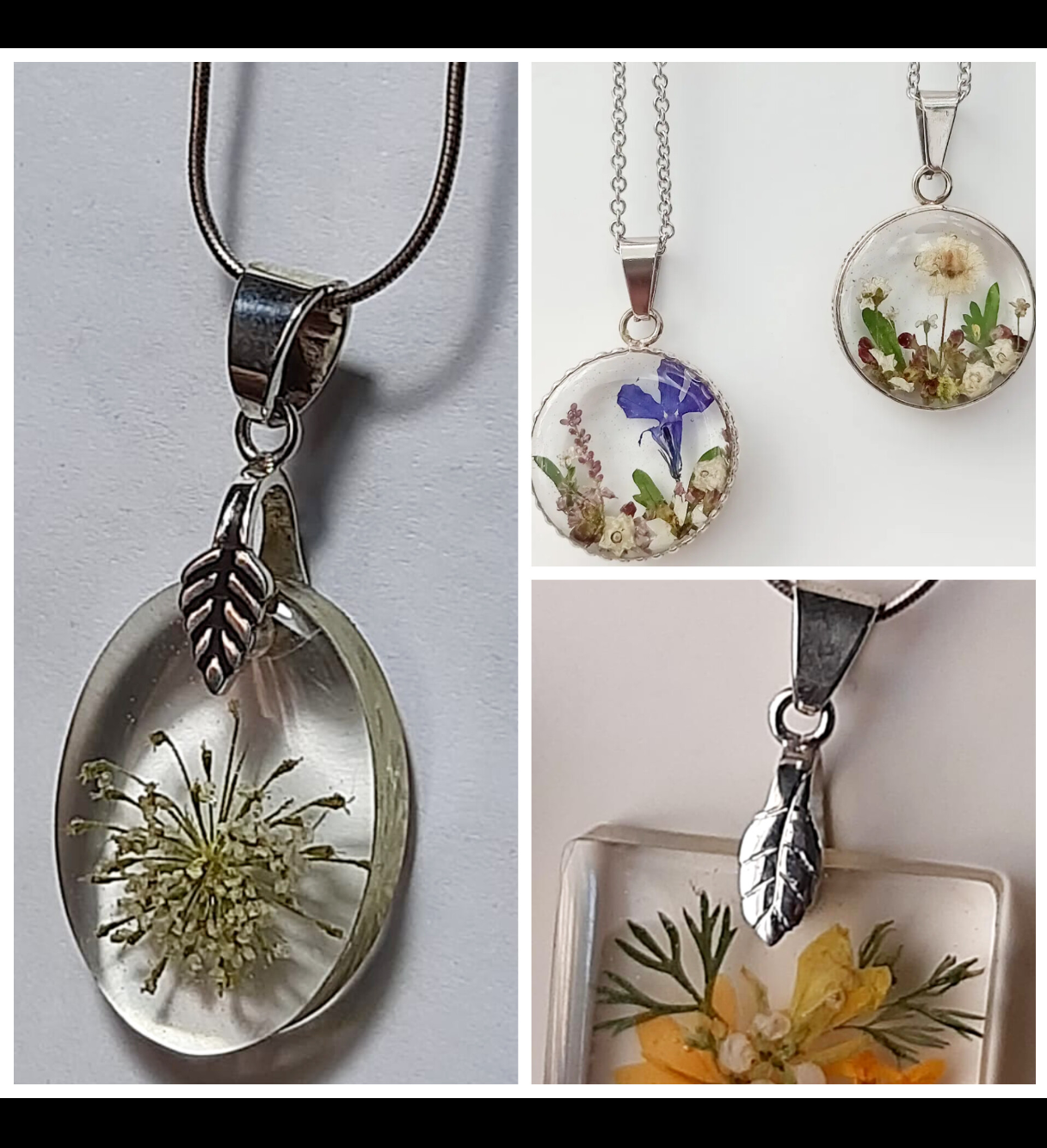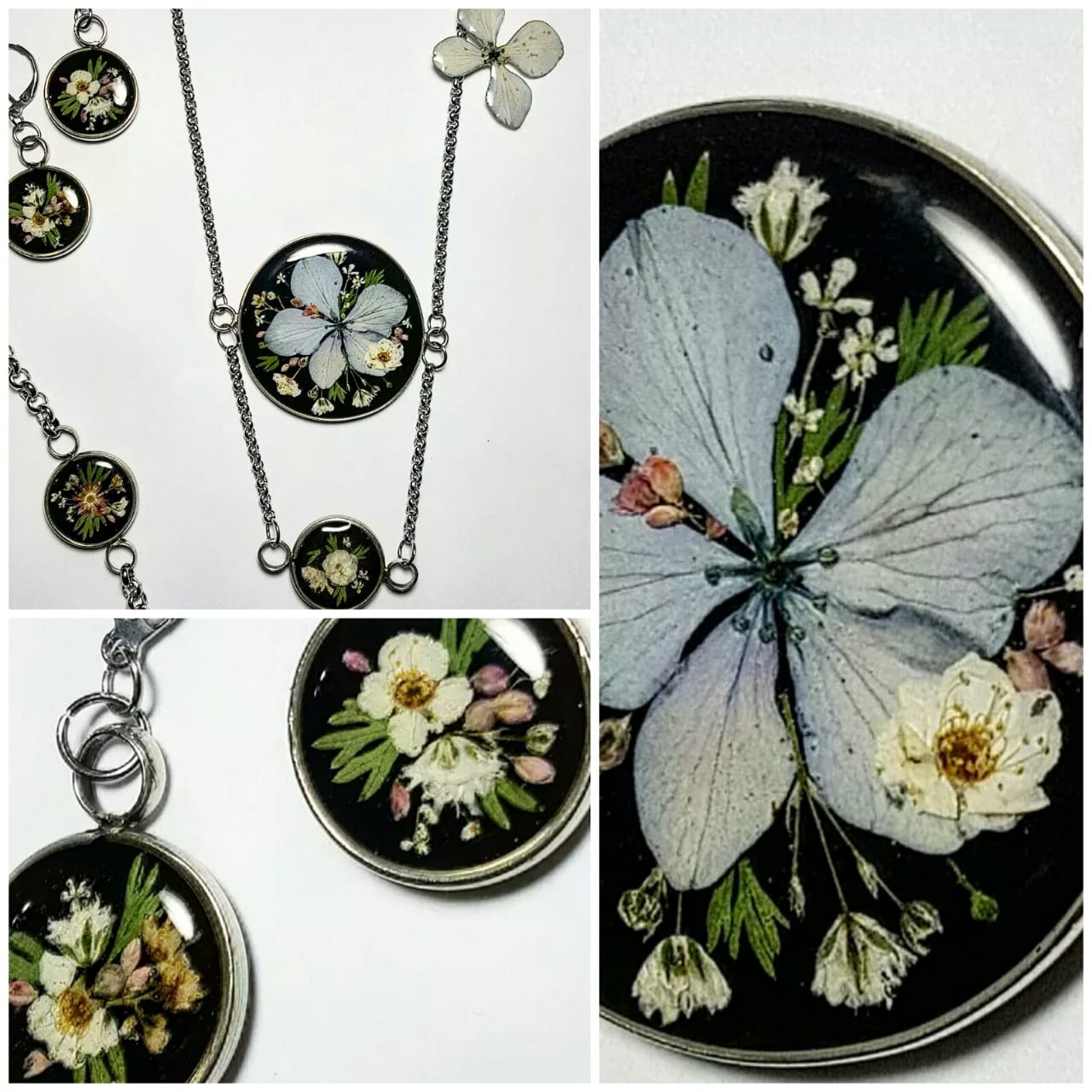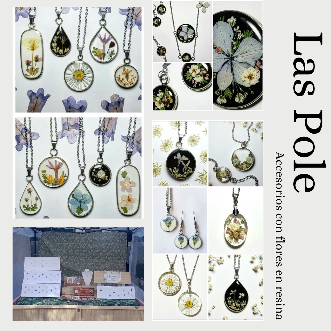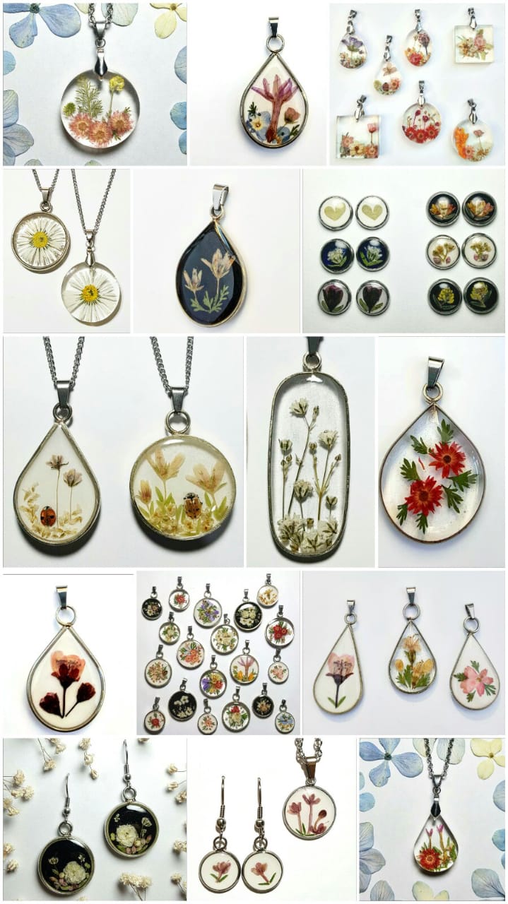 Dijes con flores silvestres previamente secadas y encapsuladas en resina. Los realizó sobre bases de acero quirúrgico y también otros con lateral de alpaca. Seco las flores por una semana o dos en prensas y luego Las trabajo en capas sobre bases o laterales,las voy rellenando con resina en capas combinadas con flores armando una composición.