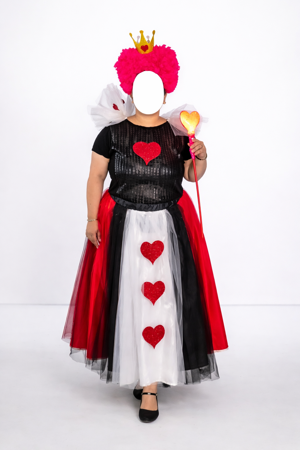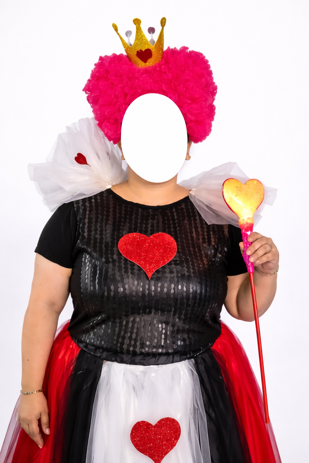 Parte superior: remera en tela con frente de lentejuelas negras y aplicación de corazón en glitter rojo, cosido y reforzado para mayor durabilidad. Cuello: volados en tul blanco semitransparente con detalles decorativos en forma de corazón. Falda: combinada en tul en tonos rojo, negro y blanco, con corazones aplicados en glitter rojo en la parte frontal. Peluca: elaborada en tul fruncido de alto volumen en color fucsia, con corona dorada decorativa con detalles de corazones. Accesorio: cetro con corazón, ideal para complementar el personaje. Medidas: Se confecciona a medida o en talles estándar (consultar disponibilidad). Proceso: Diseño y confección artesanal, con aplicaciones cosidas Ideal para eventos temáticos, fiestas de disfraces, actos escolares y producciones fotográficas.