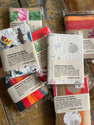 Cuadernos, libretas y agendas realizadas a mano. Tapas duras o blandas, de cartón, telas, material reusado y reproducciones de imágenes propias. Los interiores están hecho con papeles de distinto gramaje (75gr, 80gr, 120gr) en tonos neutros (ahuesado o blanco). Se aplican distintas técnicas de encuadernación: costura francesa, japonesa y anillados de doble alambre.