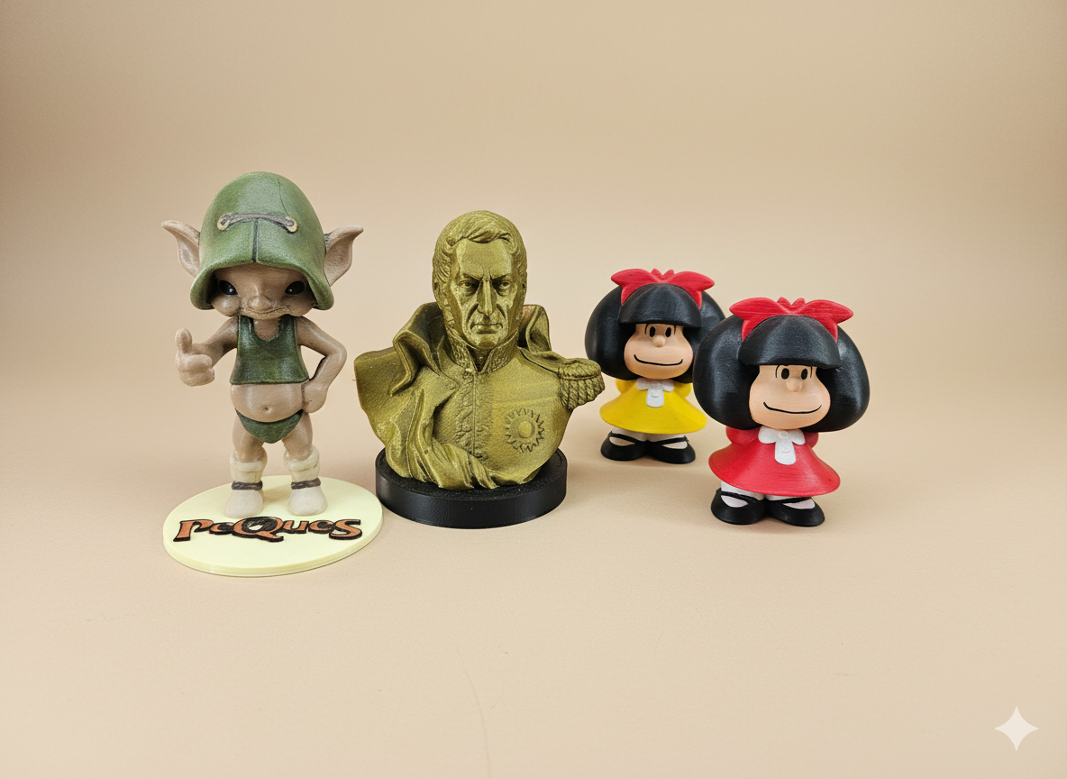 Figuras coleccionables y decorativas inspiradas en personajes y símbolos culturales nacionales. Cada pieza es diseñada digitalmente y producida mediante impresión 3D en PLA (bioplástico de origen vegetal), para luego ser lijada, pintada y terminada a mano, logrando un acabado artesanal único. En este caso las figuras tienen entre 10 y 16 cm de altura según el modelo y se destacan por su nivel de detalle y durabilidad. Son ideales para coleccionistas, decoración o regalos con identidad local.