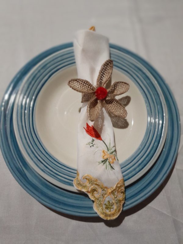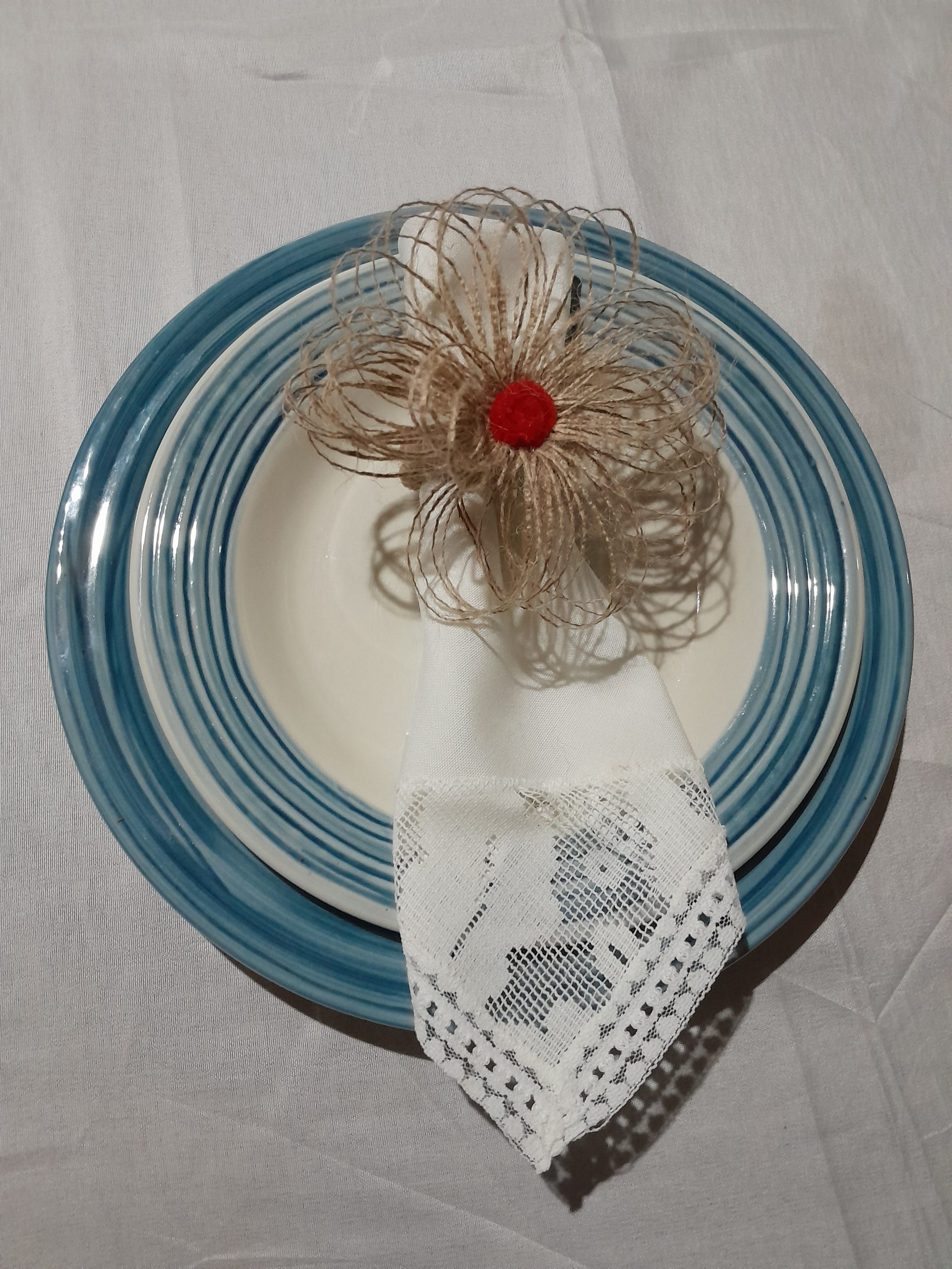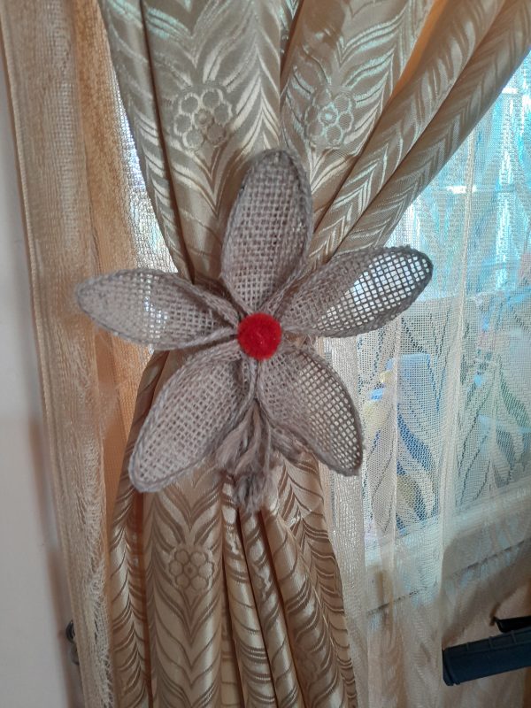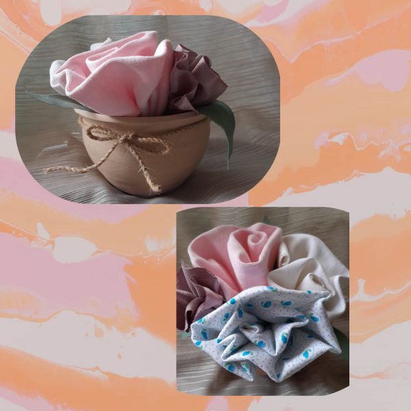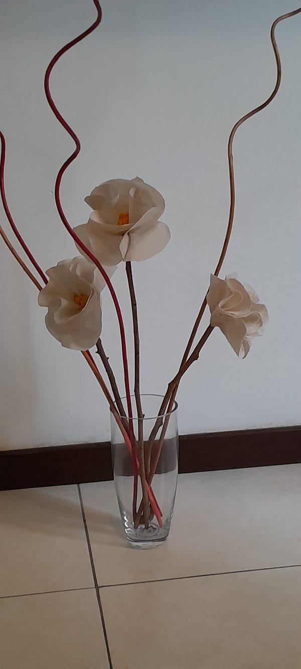Flores en tela con telas varias, diversidad de colores y formas, engomadas. Utilización de ramas naturales recicladas. Para adornos varios y tambien como apliques en otros elementos. Metodo de pegado con silicona y cocidas según el caso.