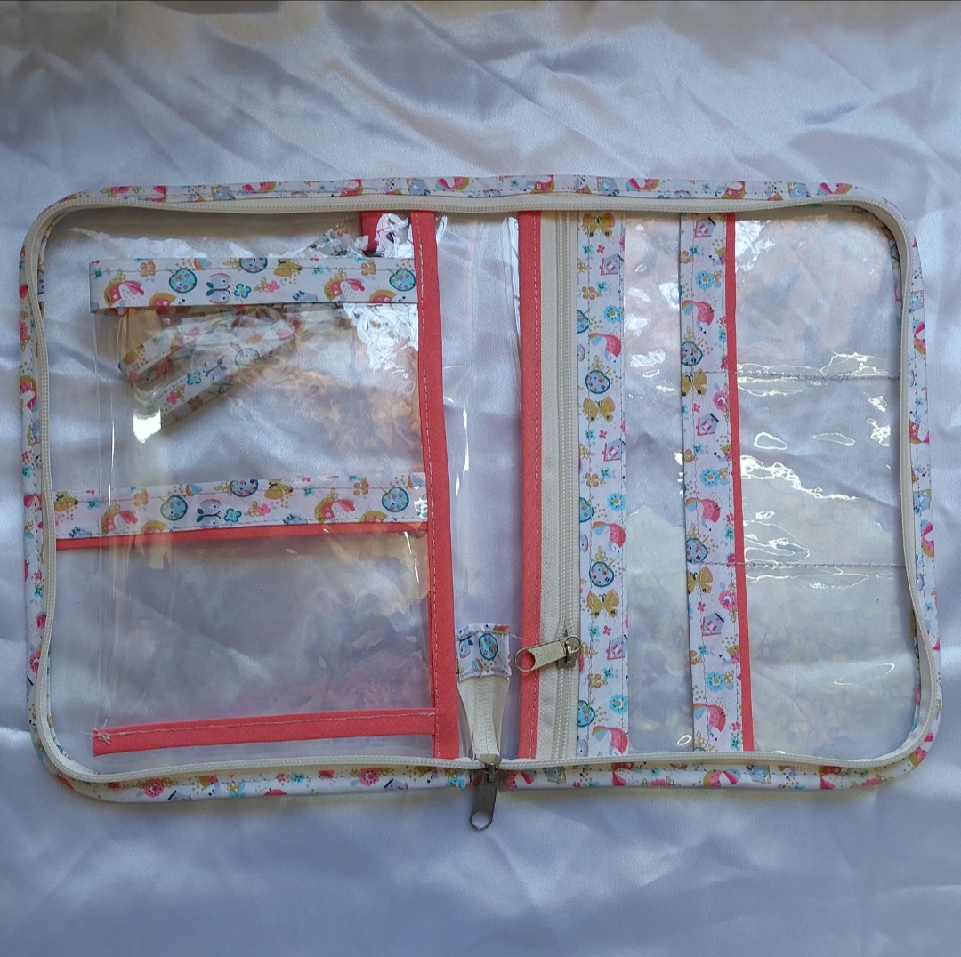 La Libreta Sanitaria / cubre agenda Amaranto es un accesorio diseñado para organizar y proteger la documentación de salud, combinando funcionalidad y diseño. Está confeccionada de manera artesanal, utilizando cinta bies estampada para el exterior y detalles combinados en colores suaves. En su interior cuenta con compartimentos de plástico transparente (PVC) que permiten visualizar fácilmente la información sin necesidad de retirarla, protegiéndola de la humedad y el desgaste. Incluye varios bolsillos internos de distintos tamaños para guardar la libreta sanitaria, estudios médicos, recetas, órdenes, carnet de vacunación y documentos personales. Posee cierres reforzados y costuras prolijas que garantizan resistencia y durabilidad en el uso diario. Las medidas aproximadas son de 27 cm de alto por 19 cm de ancho, tamaño práctico para transportar en mochila, bolso o cartera. El proceso de elaboración comprende la selección de telas, el corte manual de las piezas, el armado de los compartimentos internos, la colocación de cierres y terminaciones, y un control final de calidad para asegurar un producto funcional y bien terminado. Este producto es ideal para uso personal, infantil o familiar, facilitando el orden y el cuidado de la documentación médica en un solo lugar. Se utiliza el técnico Marroquineria plastica.