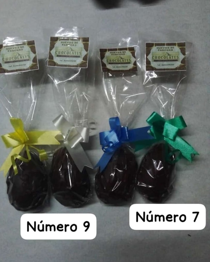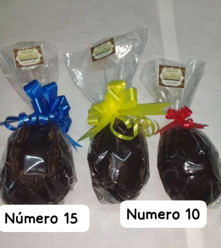 Huevos de pascua número, 7,9,10,15 de chocolate leche , blanco, semi amargo y marmolado, rellenos con lentejas de chocolate, maní con chocolate, huesitos, bombones, decorados con chocolate.