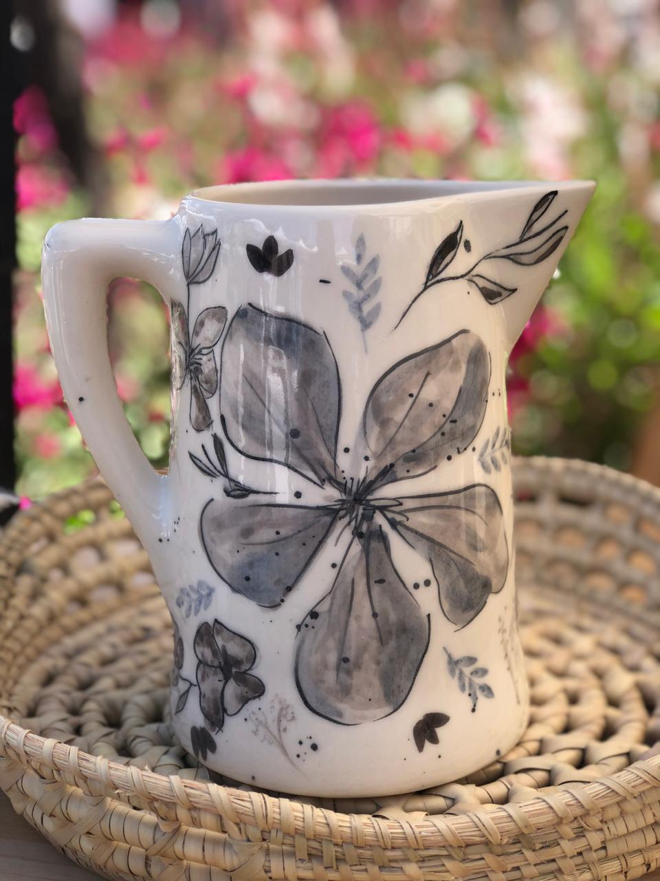 Jarra de 1,5 lt realizada en Ceramica de baja temperatura, realizada por moldeo y decorada a mano