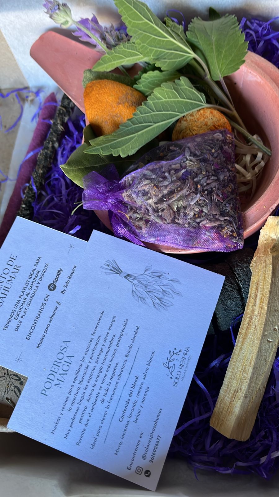 Hierbas y resinas para equilibrar los espacios, favoreciendo la apertura, liberación y purificación. Muy poderosa: limpia los espacios, protege y atrae energía positiva. Activa la energía transmutadora. Permite que el ambiente se torne más liviano, protegiéndolo de todo lo negativo. Ideal para elevar la frecuencia vibratoria. Brinda claridad. Contenido del kit: Mirra, incienso, lavanda, romero, salvia blanca, benjuí, naranja, sahumador, bombitas, carboncitos e inciensos.