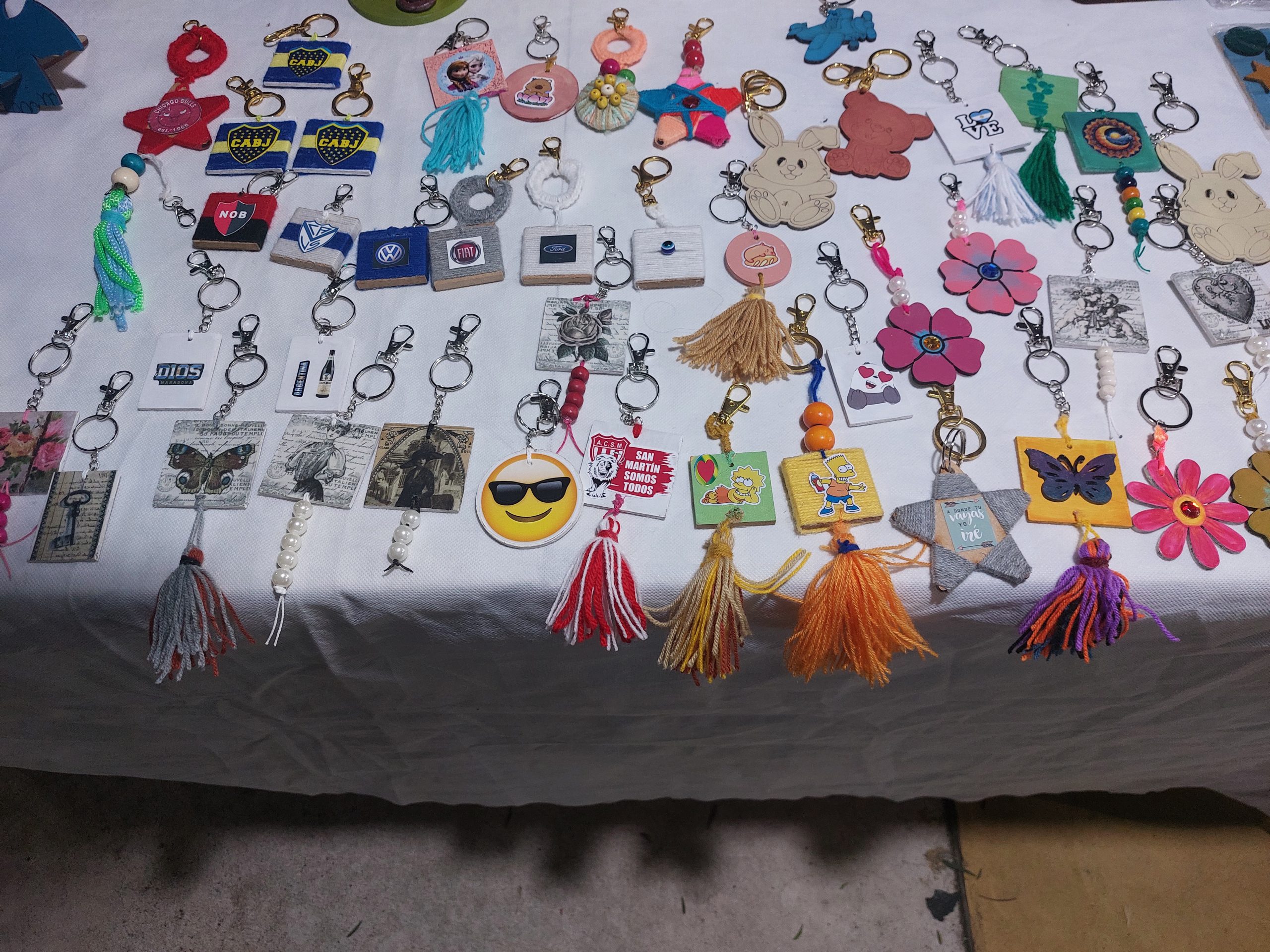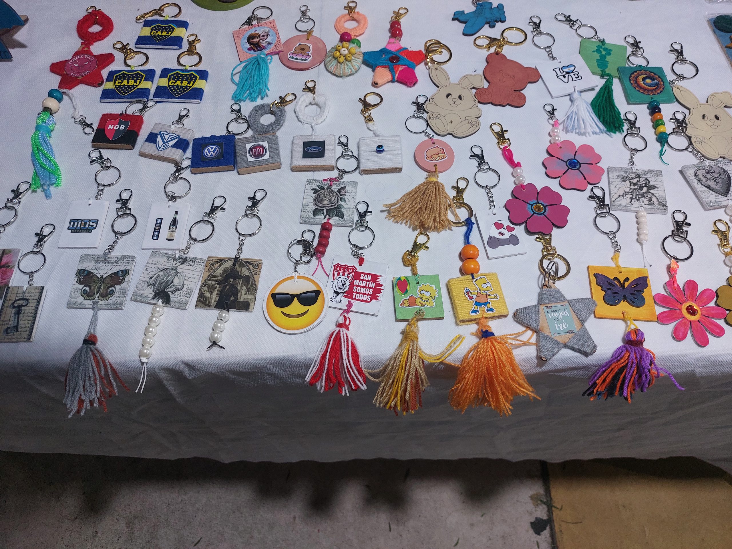Para los llaveros utilizamos madera de distintas medidas. Algunos llaveros están forrados con lana luego se coloca un stiker ,se les hace una borla con lana de distintos colores combinada con temática del llavero y se termina colocando el mosquetón. También se hacen llaveros pintados con la técnica de puntillismo, otra con decoupage, tambien con técnica de craquelado.Otras se pega stiker infantiles para mochilas, se les hacen borlas de distintos colores..otros se hacen con madera forrados en lana para colgar en las mochilas.