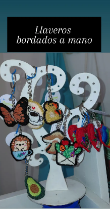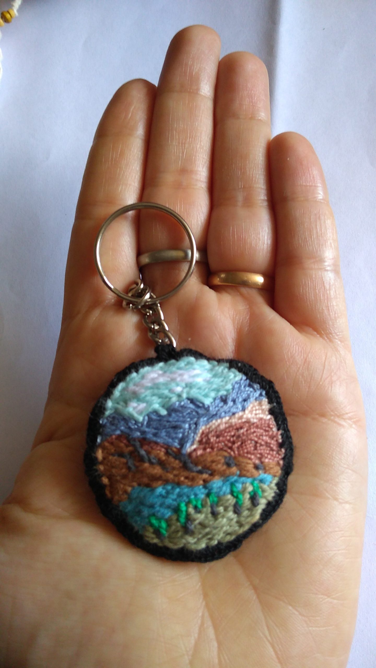 Llaveros, borlas, pin, aros. Bordados a mano en tela de tropical mecánico.