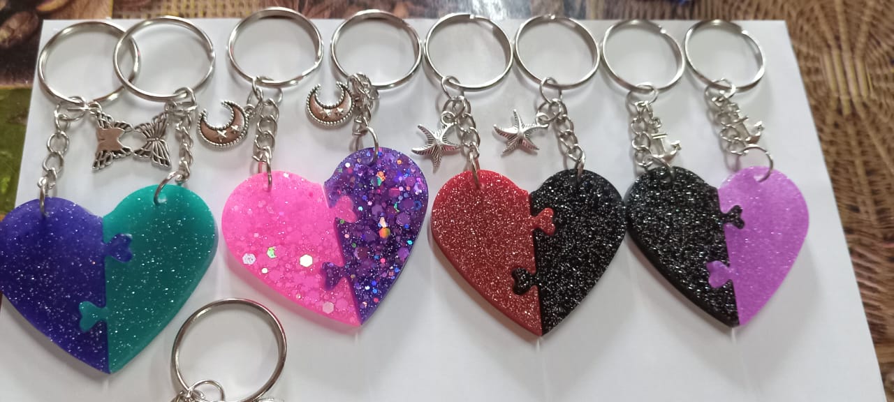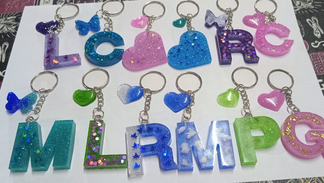 Llaveros y accesorios realizados en resina epóxica moldeados y pigmentados con una amplia variedad de colores y formas.