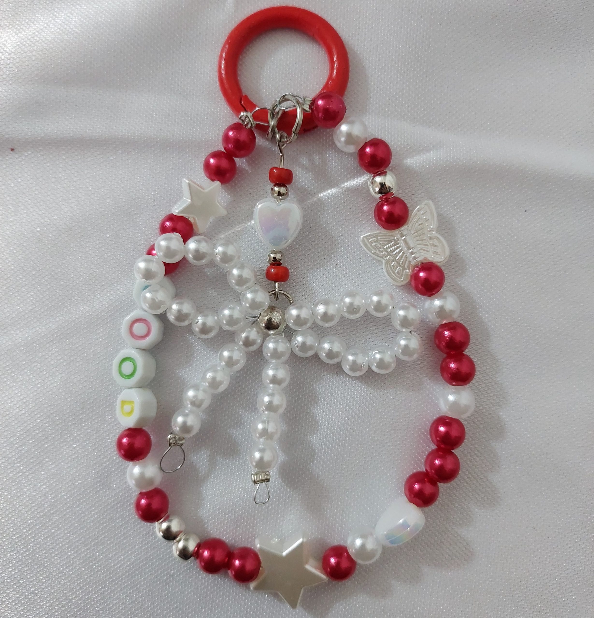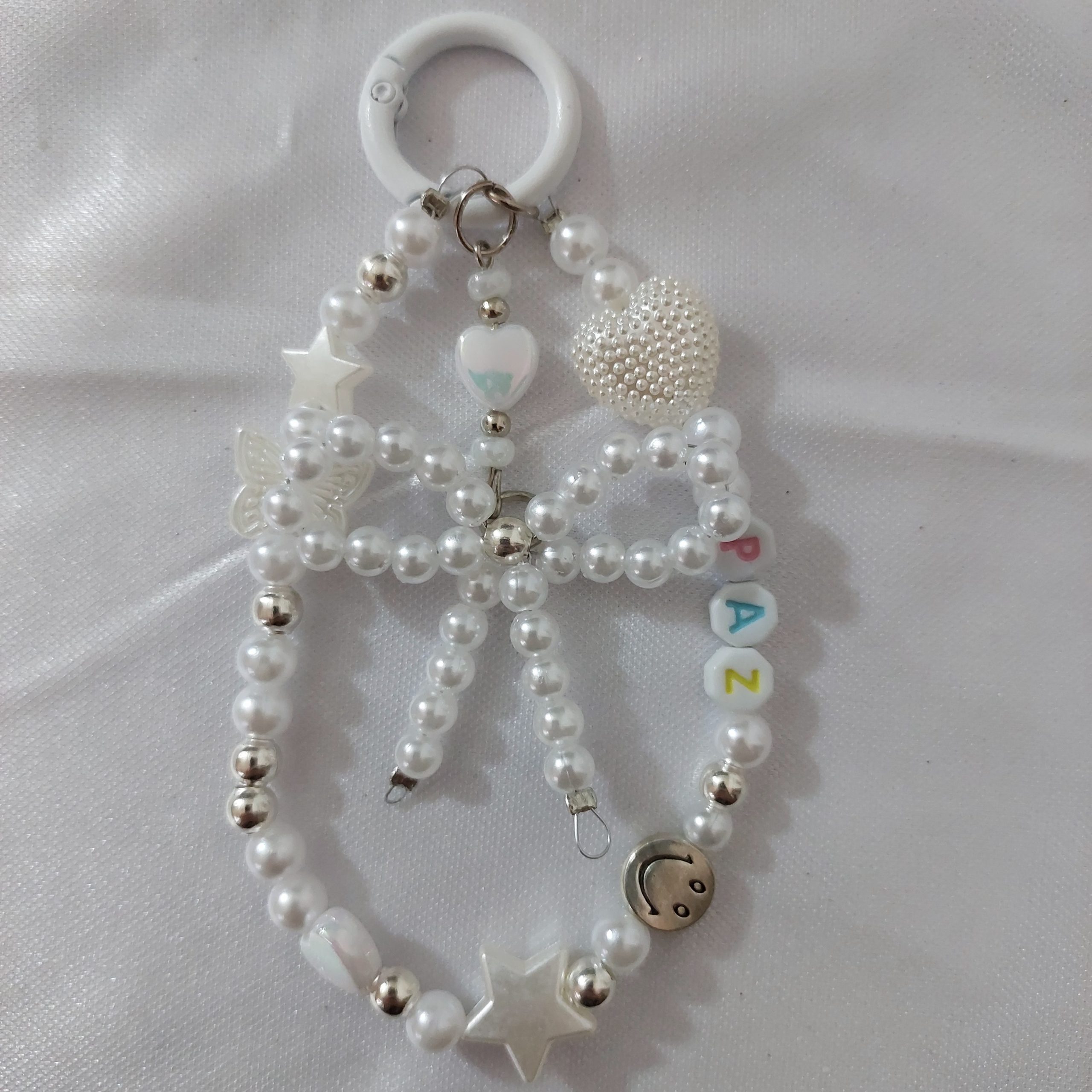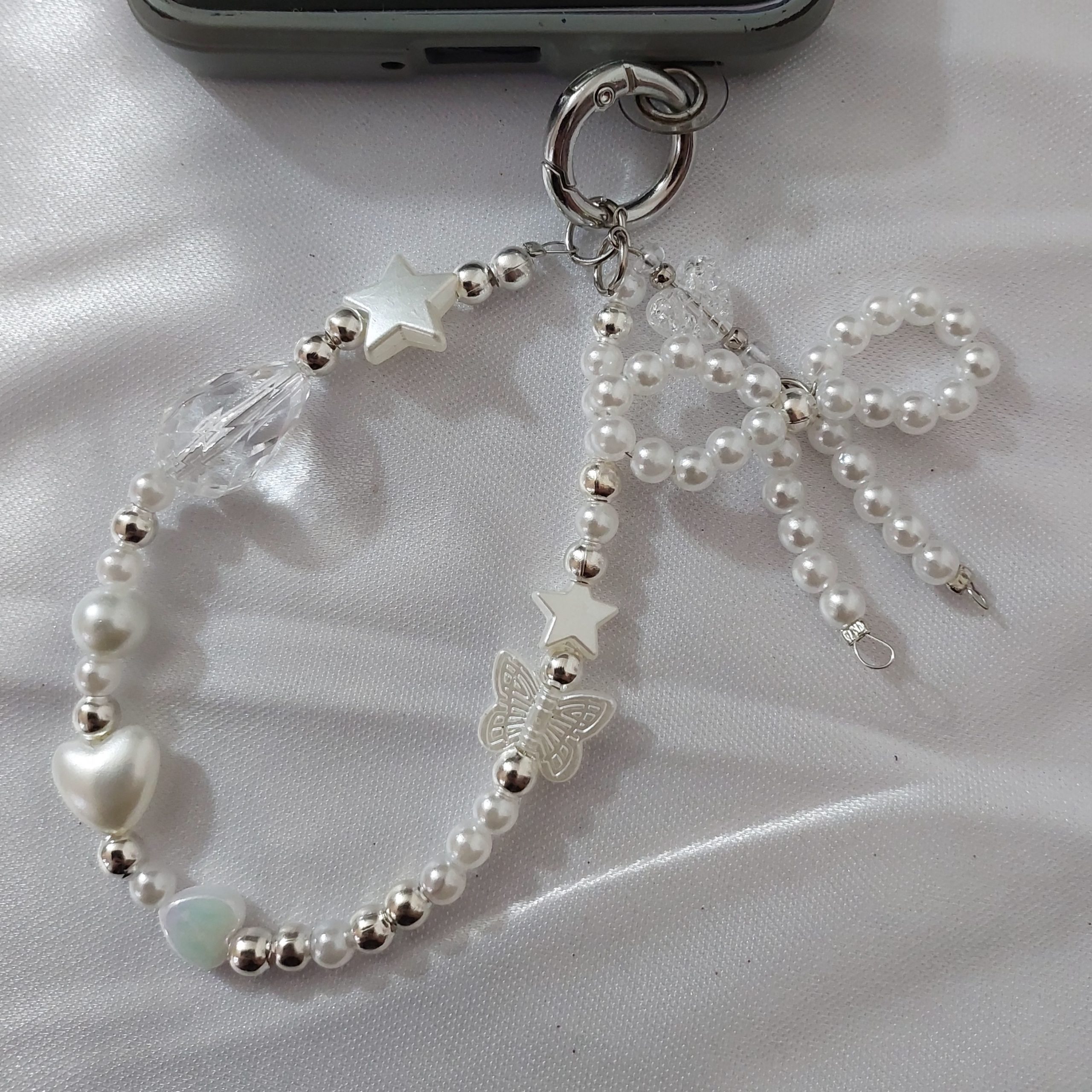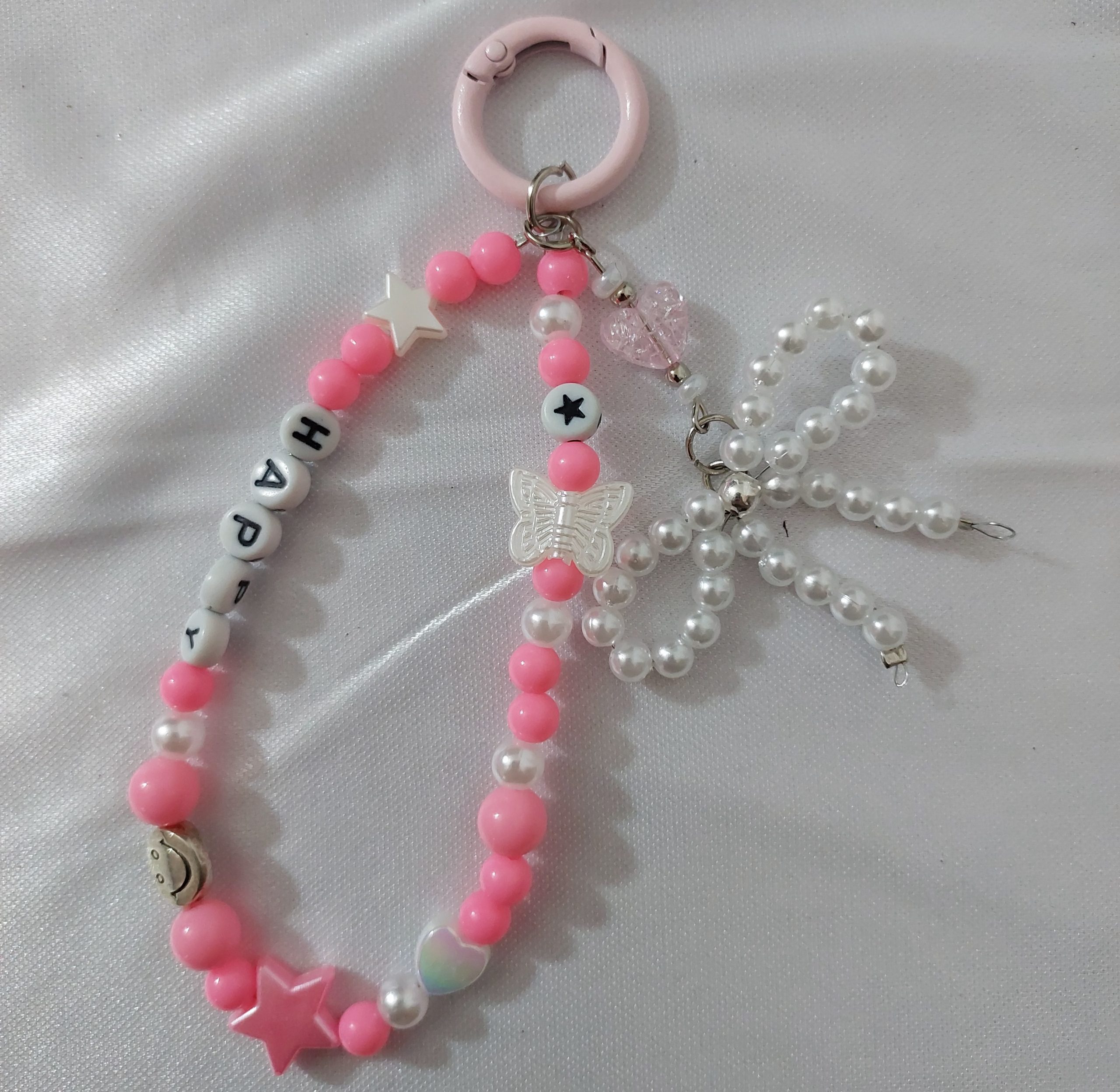 El producto consiste en un llavero para teléfono celular, diseñado como accesorio funcional y decorativo. Está elaborado de manera artesanal, cuidando cada detalle del proceso de armado. Se fabrica con perlas sintéticas de distintos tamaños, cuentas plásticas y acrílicas transparentes, y dijes decorativos en tono plateado con formas de corazón, estrella y mariposa. Incluye un moño confeccionado íntegramente con perlas, que aporta un diseño delicado y distintivo. Los separadores y eslabones son metálicos, lo que brinda mayor resistencia y durabilidad. El llavero cuenta con un aro metálico con cierre que permite sujetarlo fácilmente al teléfono mediante adaptador, así como también a llaves, mochilas o carteras. Su estructura es liviana, cómoda de transportar y segura para el uso diario. Las medidas aproximadas del producto son de entre 15 y 18 cm de largo, dependiendo del diseño final. El proceso de elaboración es manual: selección de materiales, combinación de colores y formas, armado de las piezas, ajuste de cierres y control final de calidad para garantizar un producto prolijo y resistente. Este llavero cumple una doble función: práctica, al facilitar el agarre del teléfono y evitar caídas, y estética, al sumar un accesorio elegante y personalizable. Se utiliza la técnica enebrado de bijou