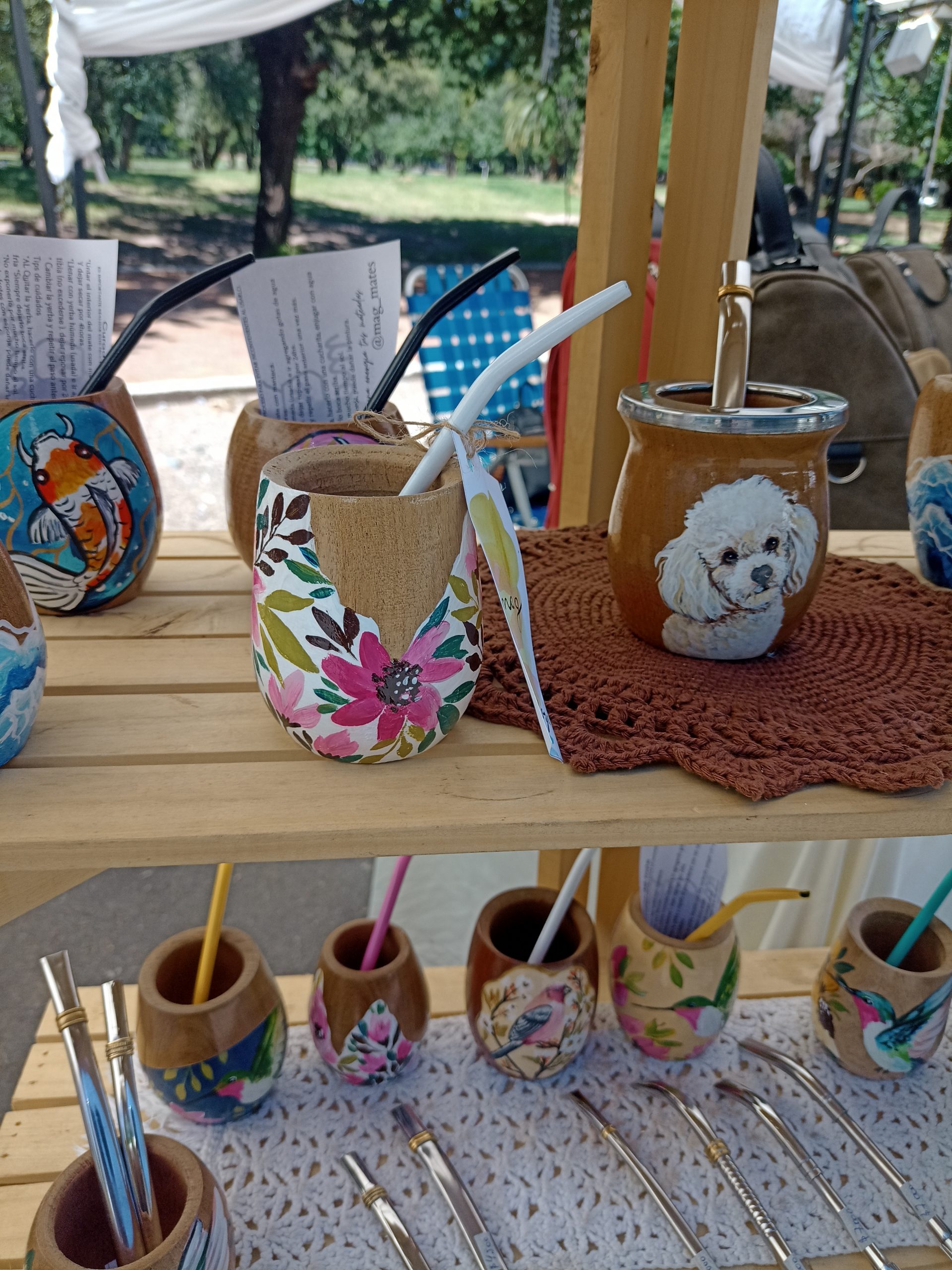 Diferentes diseños ,medida aproximada 9cm . Incluye bombilla Podes armar tu set con yerberas, azucareras, cuencos, cucharas, bandejas todo pintado con mucho amor.