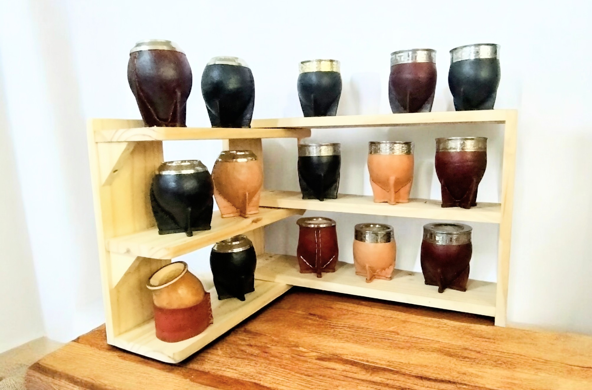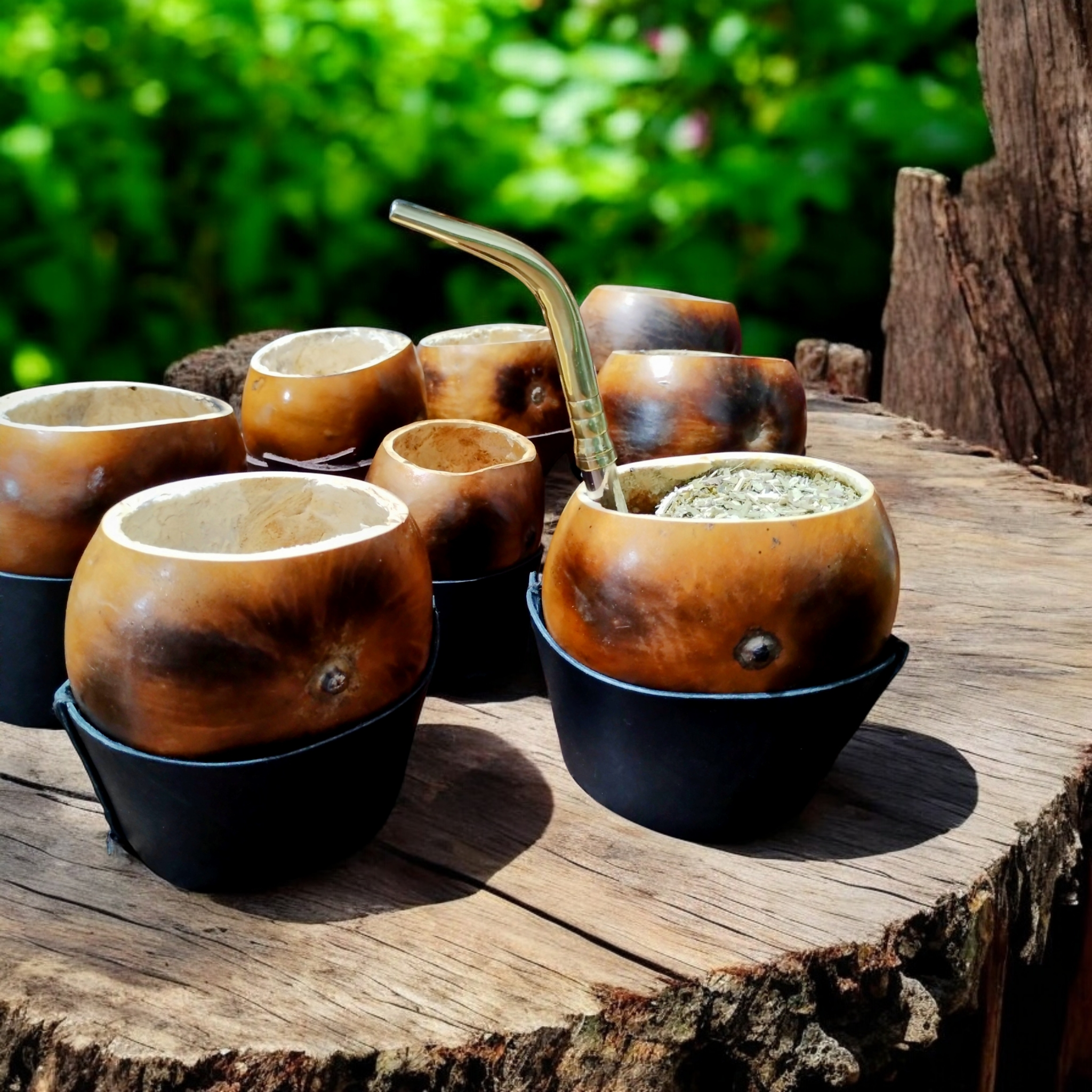 Mates totalmente artesanales hecho a mano, en cuero, cosidas a mano,calabazas torneadas y virolas que le dan un toque distinguido
