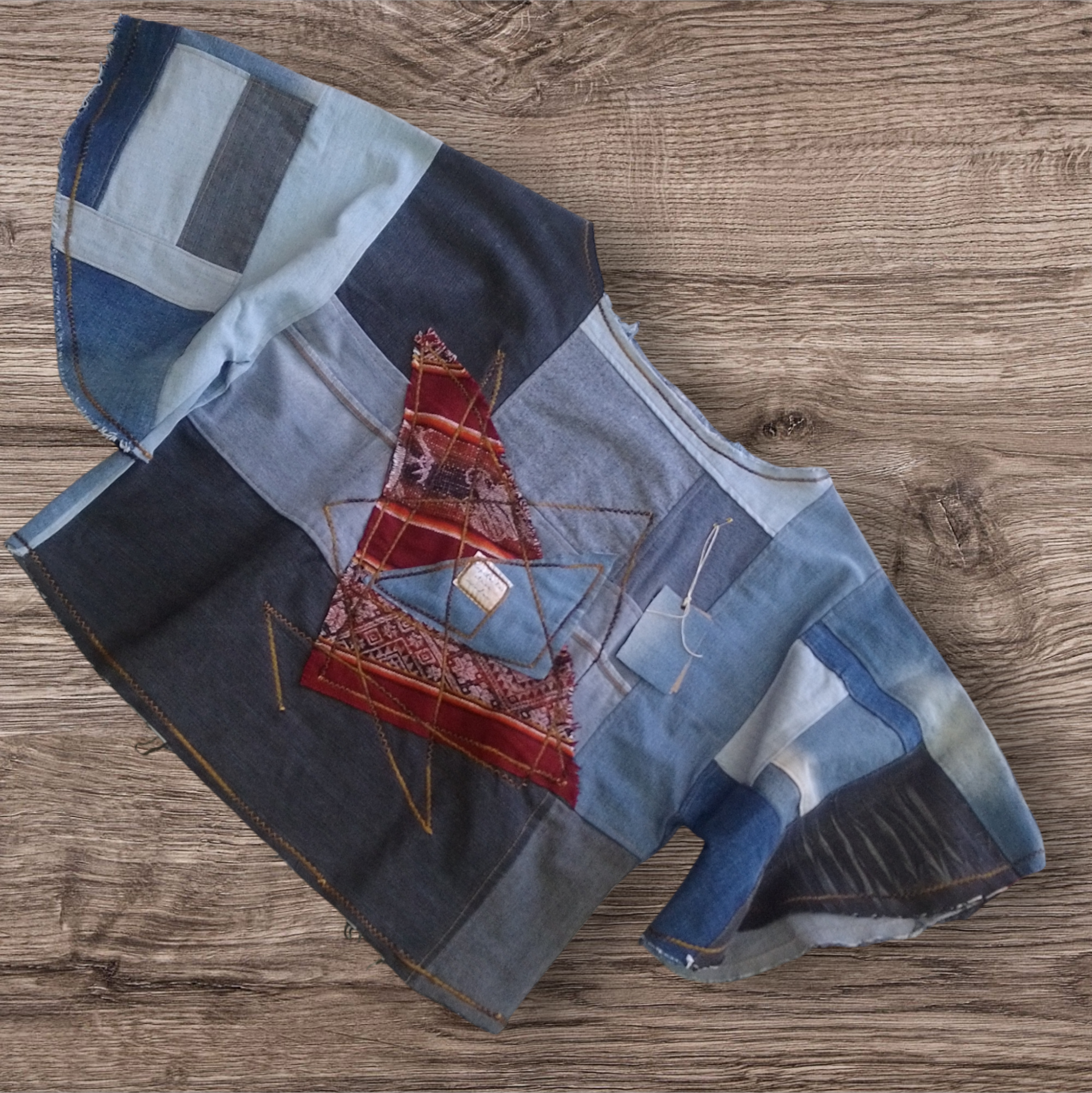 Remeron de jean , diseño único ,talle M, detalles de Aguayo y diseño en lana.