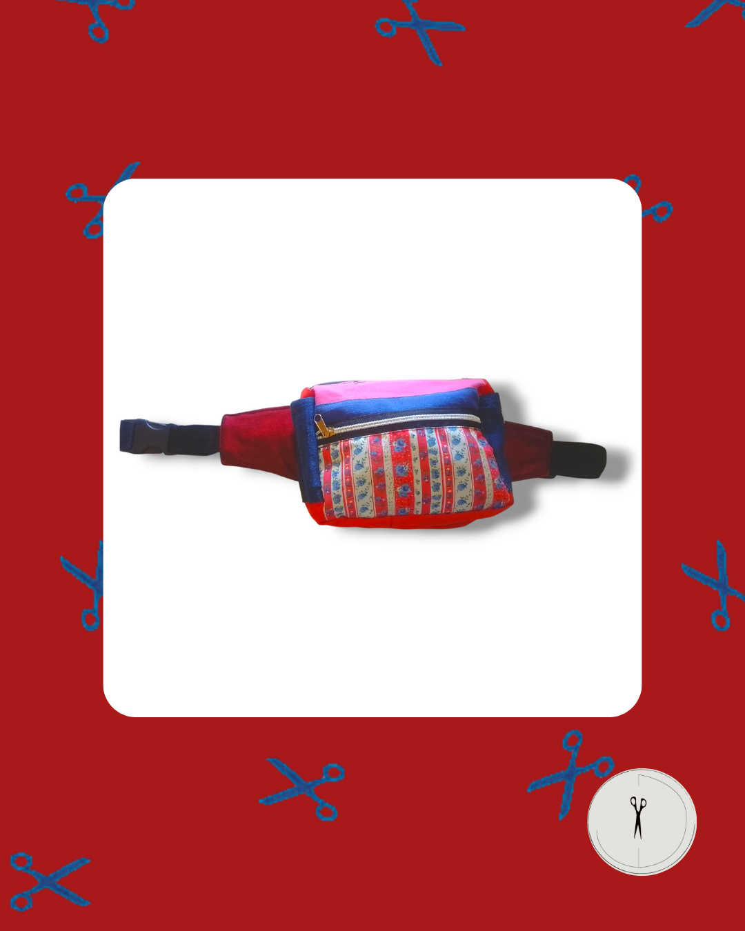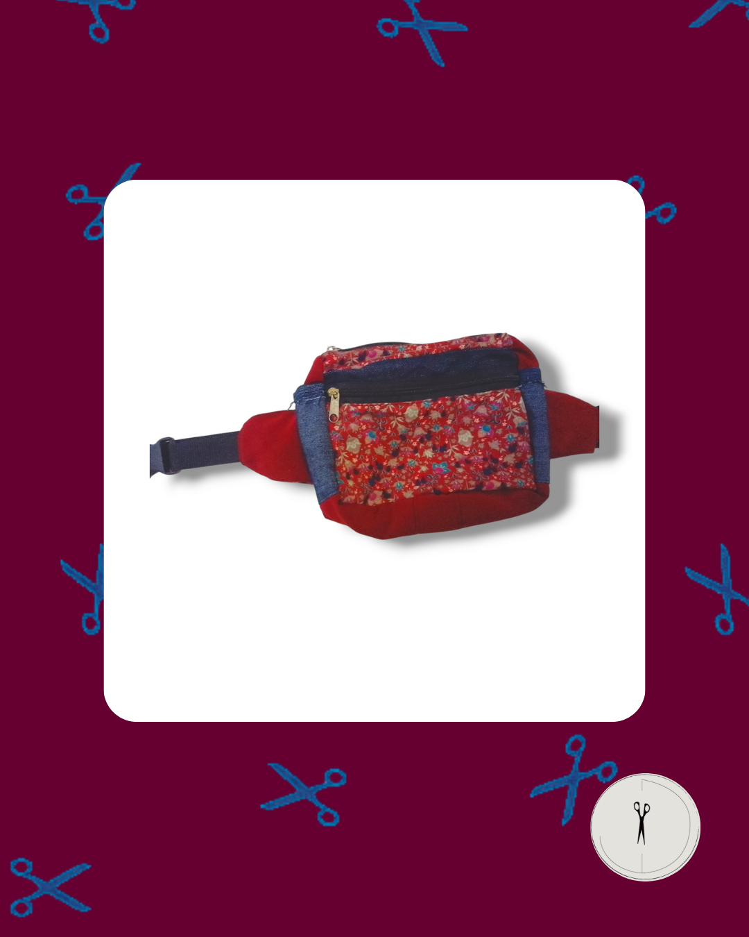 Reciclado a partir de prendas en buen estado. Largo 20 cm, alto 15 cm, ancho 8 cm, correa ajustable de largo máximo 130 cm. Costuras y cierres reforzados. Bolsillos laterales, frontal, trasero y central. Con forro.