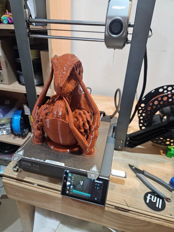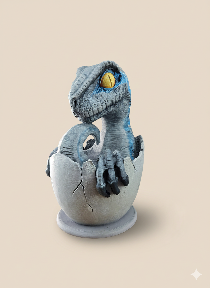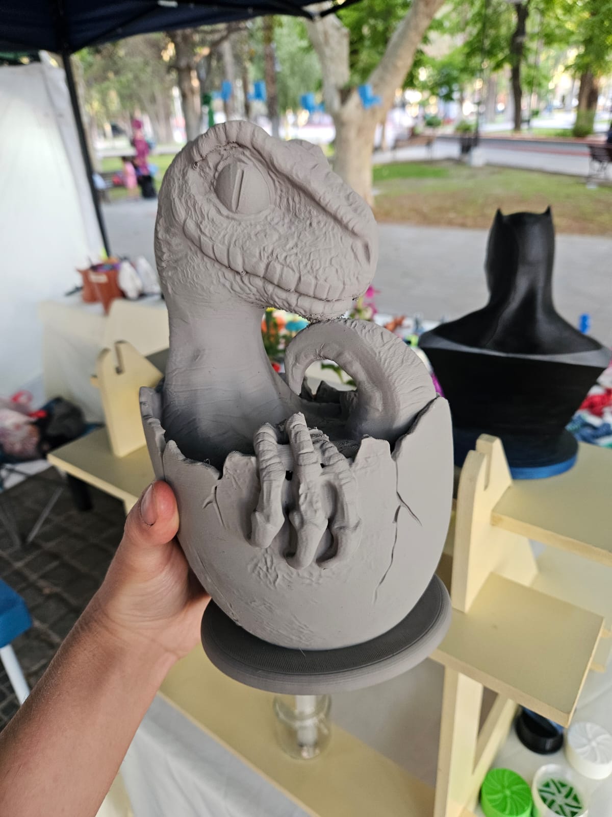Ofrecemos un servicio de impresión 3D personalizado, a partir de imágenes, ideas o modelos de referencia. En este caso, se desarrolló una figura de dinosaurio saliendo del cascarón, replicando una imagen provista por el cliente. La pieza mide 24 cm de altura, fue modelada digitalmente, impresa en PLA y luego intervenida artesanalmente con pintura y detalles a mano, logrando un acabado realista. Este servicio permite materializar diseños únicos: personajes, objetos decorativos o piezas técnicas, adaptados a las necesidades de cada persona.