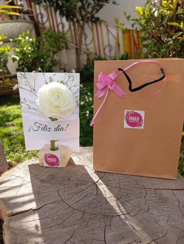 Tarjeta Floral con flores naturales Tubo de vidrio, base de mdf, papel tarjeta para tarjeta frontal y trasera y envoltorio con bolsa papel y moño.Peso casi 10 gramos