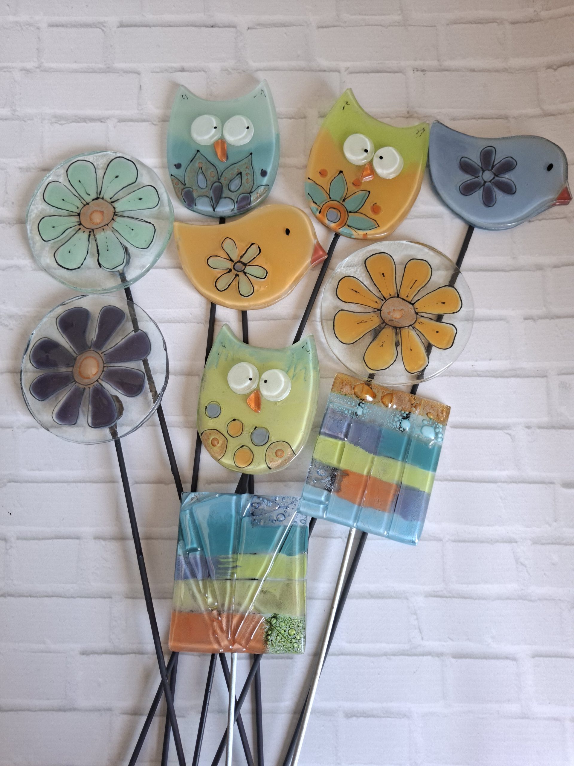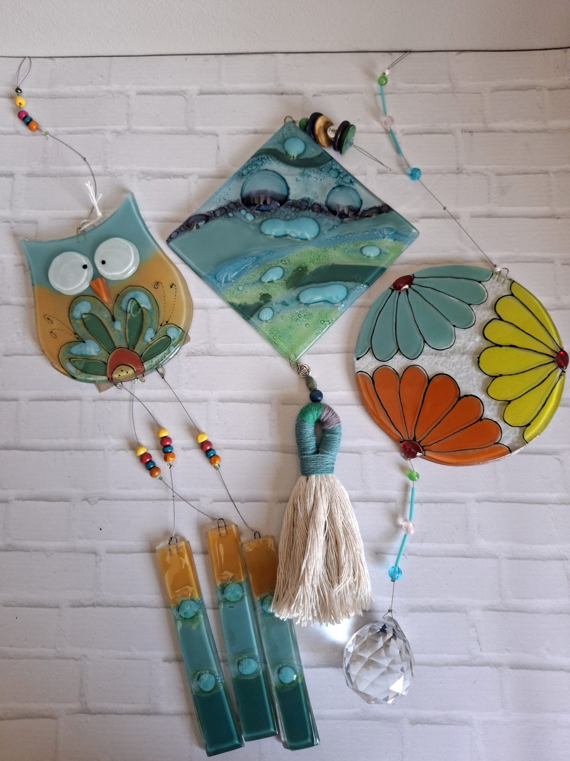 Productos decorativos en vitrofusión. Se utiliza vidrio float de 3 mm, esmaltes plenos y con burbujas, grisallas, y se hornea a más de 800 °C. Variedad de llamadores, jazmineros, tutores, porta sahumerios, bandejas, y más.